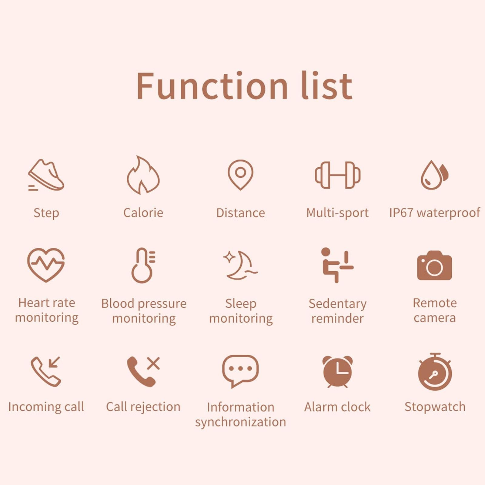 • Functions include call, SMS, WeChat, and QQ reminders, exercise tracking, sleep monitoring, heart rate and blood pressure detection, exercise mode, remote photo, sedentary reminder, phone finder, and menstrual cycle reminder