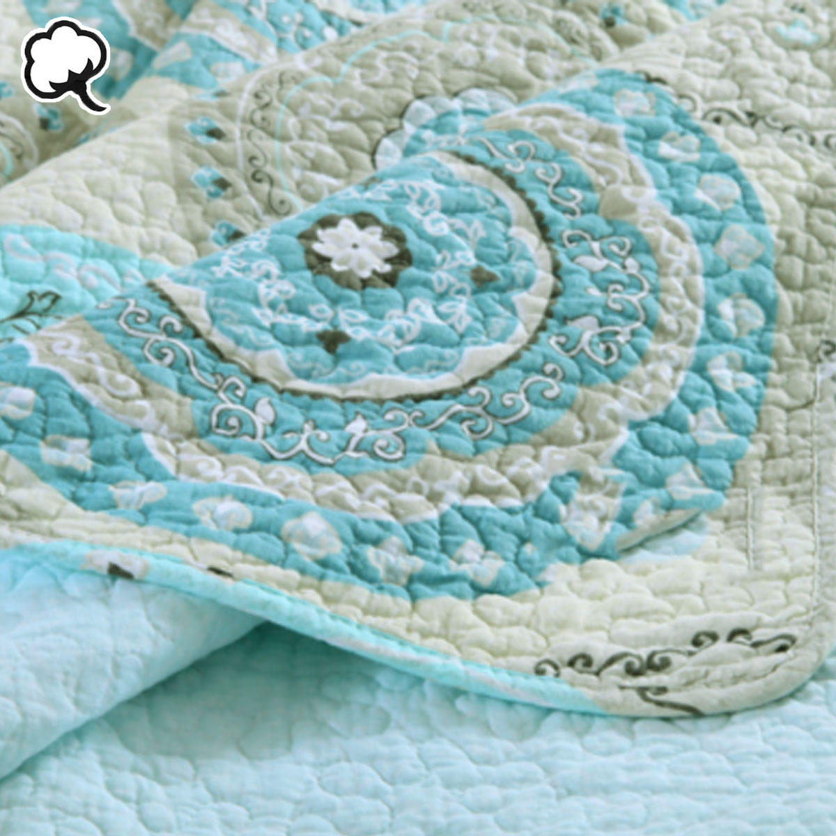 This contemporary 100% Cotton Lightly Quilted Coverlet Set Suzani Queen will help you create your dream bedroom style. It features a soothing quilted mandala circles design in soft colour hues of turquoise, cream, brown, and white. Approx 150gsm filling. Exquisite quilting process of quit set can maintain cotton filler effectively. Light weight, medium warmth, year-round use Easy-Care Machine Washable, Prewashed and preshrunk. It is made from soft touch and easy care 100% Cotton fabric and Pure Cotton filling with softness that offers a relaxing night’s sleep.