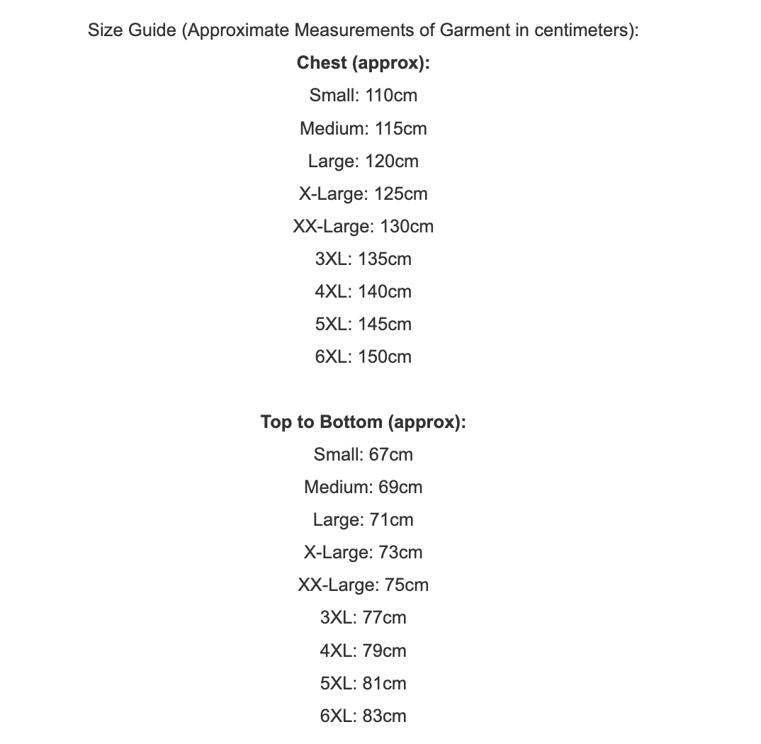 Size Guide (Approximate Measurements of Garment in centimeters):