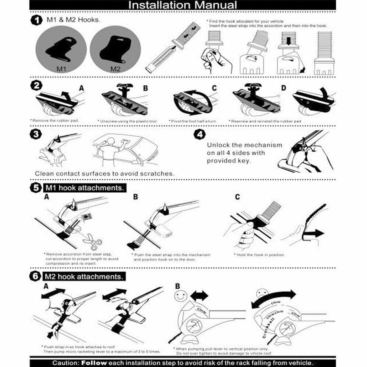 - Adjustable straps and two types of clamps/hooks to fit most vehicles