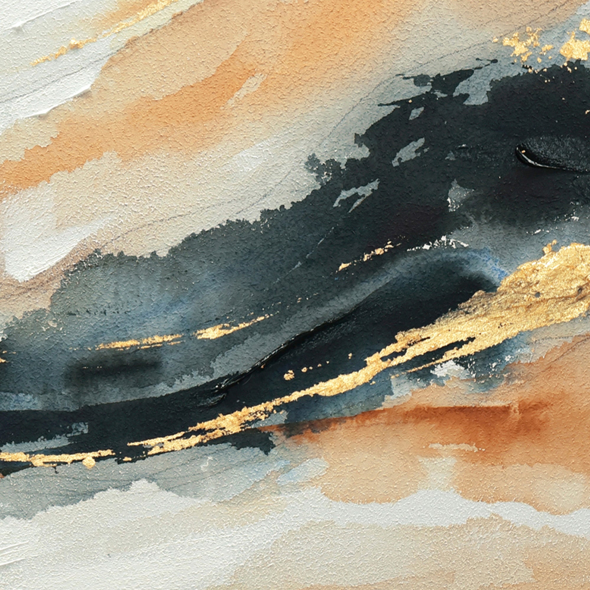 “Riptide Reverie” emerges as a captivating 120cm x 80cm canvas, where the raw essence of nature meets the delicate nuances of color. On a backdrop of pastel orange and luminous white, a striking wave of black takes center stage, reminiscent of the ocean’s powerful riptides. This dark surge is elegantly punctuated with gleaming gold highlights, offering both contrast and a hint of opulence. The soft pastel hues above and below the wave gracefully counterbalance its intensity, crafting a harmonious visual narrative. The piece’s thick texture further accentuates its tangible depth and emotion. Framed within a refined dark wood border, “Riptide Reverie” stands as a testament to the profound beauty of abstraction and the masterful touch of hand-painted artistry.