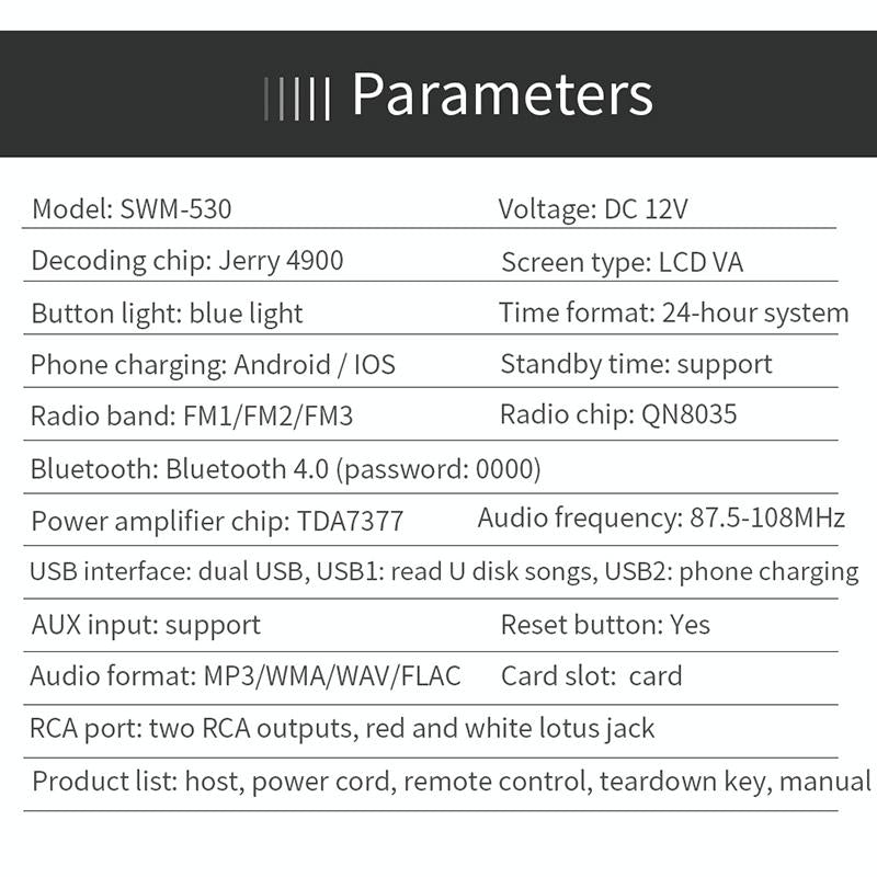• Supported audio formats: mp3, wma, wav, flac specifications radio band: fm1/fm2/fm3
