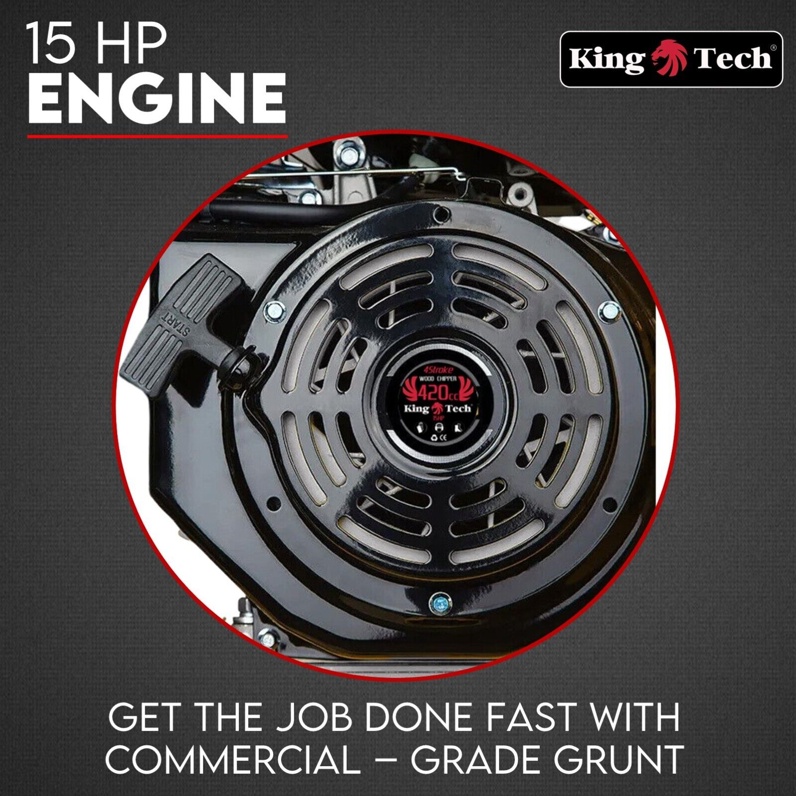 This Kingtech 15HP Wood Chipper/Shredder is a great way to quickly turn yard waste into ground cover for gardens or trees. Dual feed: use the drop-in shredding hopper for brush and leaves and the dedicated chipper chute for sticks and branches. 420cc engine displacement with pull start system