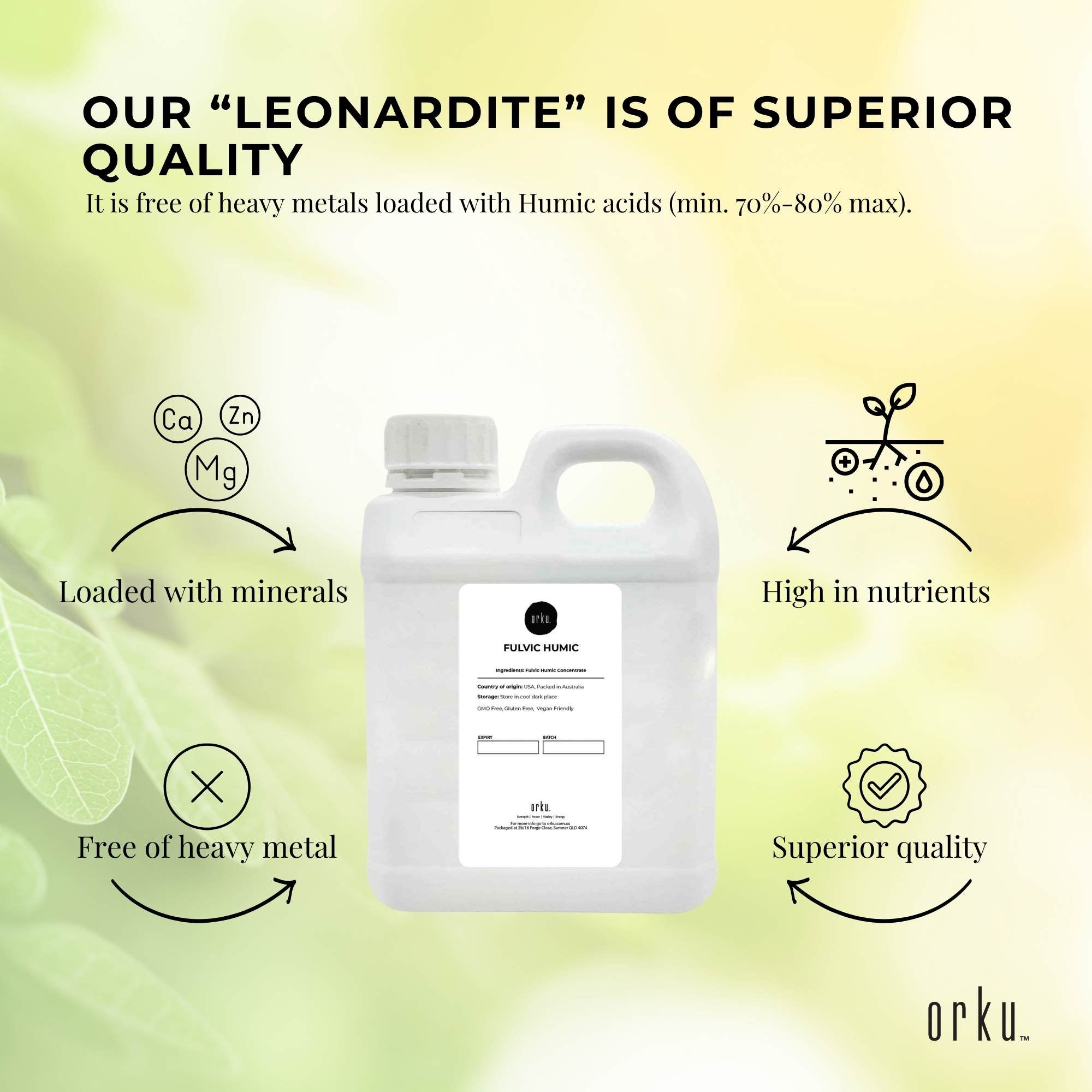 Humic substances are broken down into humic acid, and fulvic acids. The Fulvic fraction/component in our Organic Leonardite is approx 30%, perhaps the highest available in the world. Research into humic and fulvic acids have found them to be very beneficial, if not vital for human health, animal health and the health of the soils that grow the pastures for animals and or horticultural/agricultural crops hence the food we eat.