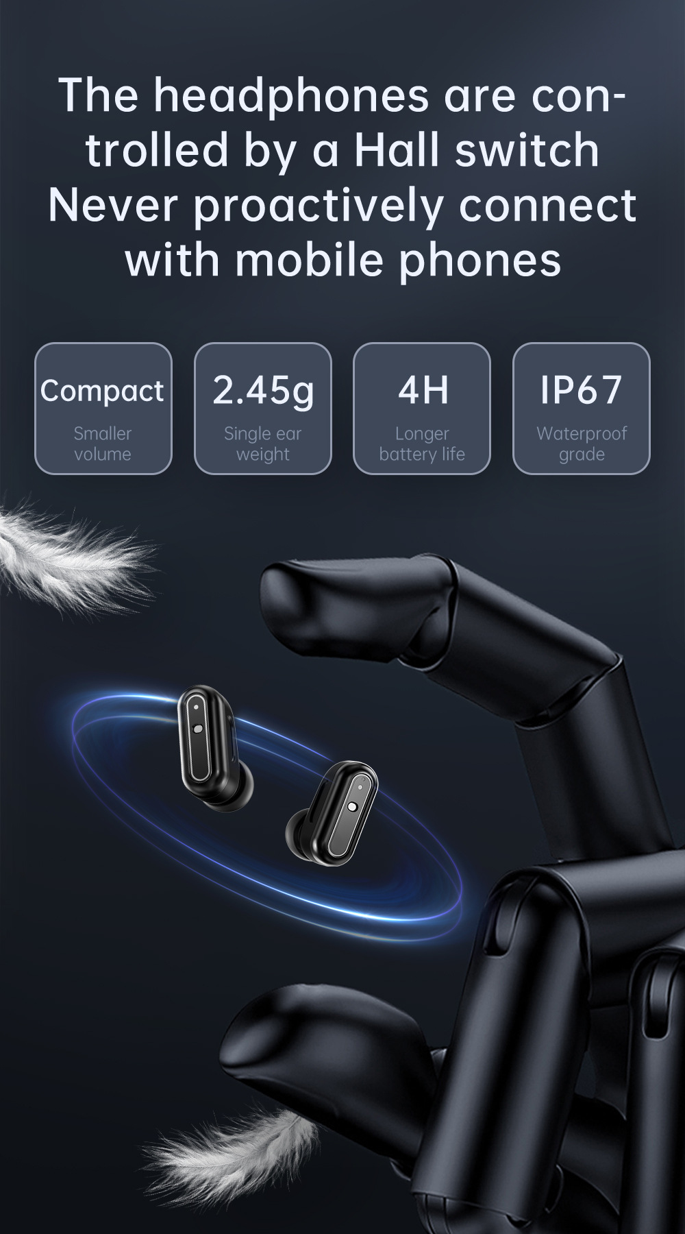 • Integrated TWS Earphones: Compact (2.45g each), IP67 waterproof, Hall switch control, offering up to 4 hours of playtime.