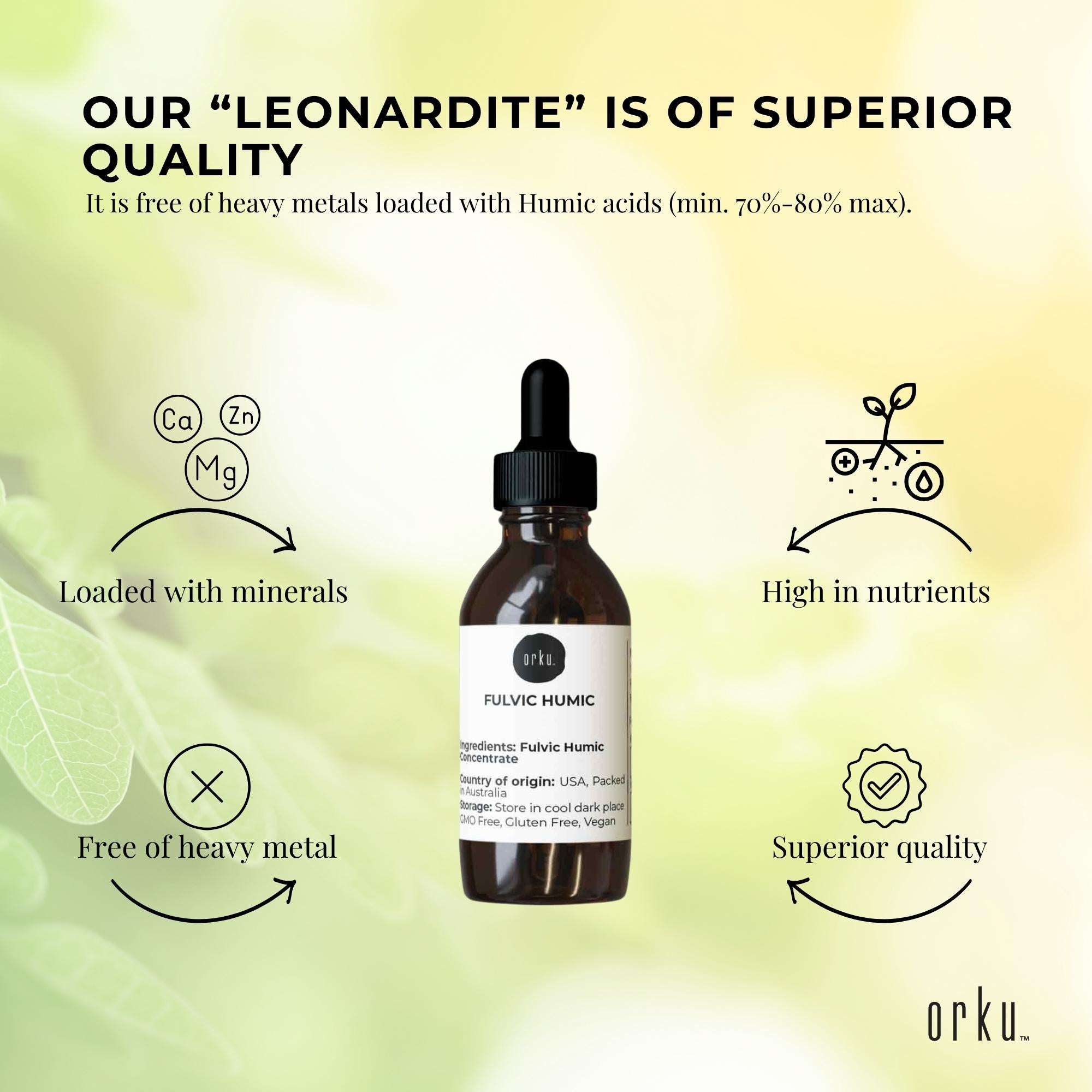 Humic substances are broken down into humic acid, and fulvic acids. The Fulvic fraction/component in our Organic Leonardite is approx 30%, perhaps the highest available in the world. Research into humic and fulvic acids have found them to be very beneficial, if not vital for human health, animal health and the health of the soils that grow the pastures for animals and or horticultural/agricultural crops hence the food we eat.