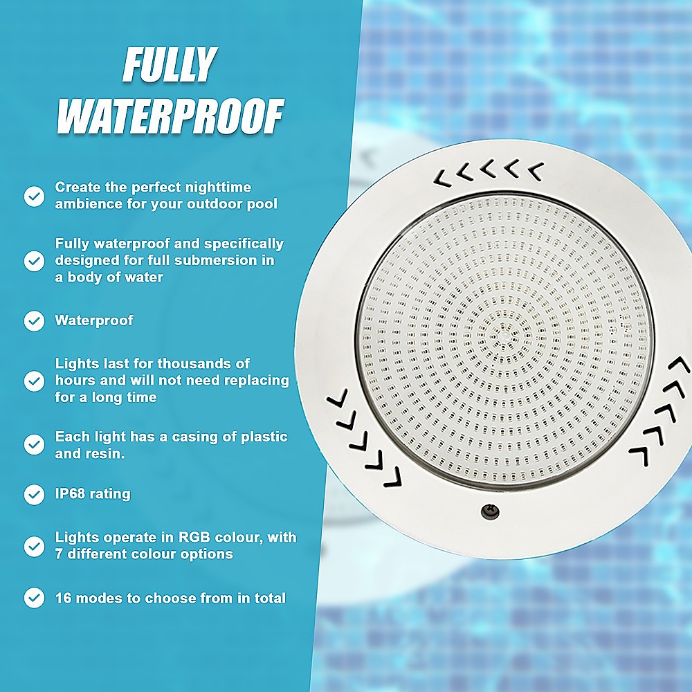 The lights operate in RGB colour, with 7 different colour options. There are 16 modes to choose from in total, all of which can be controlled via the accompanying remote control. This allows you to easily change the colour from a distance, which can make quite the impact on guests at a pool party.