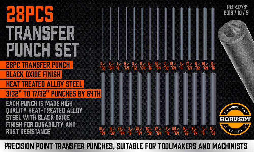 - Wide set of transfer punches from 3/32″ to 17/32″
