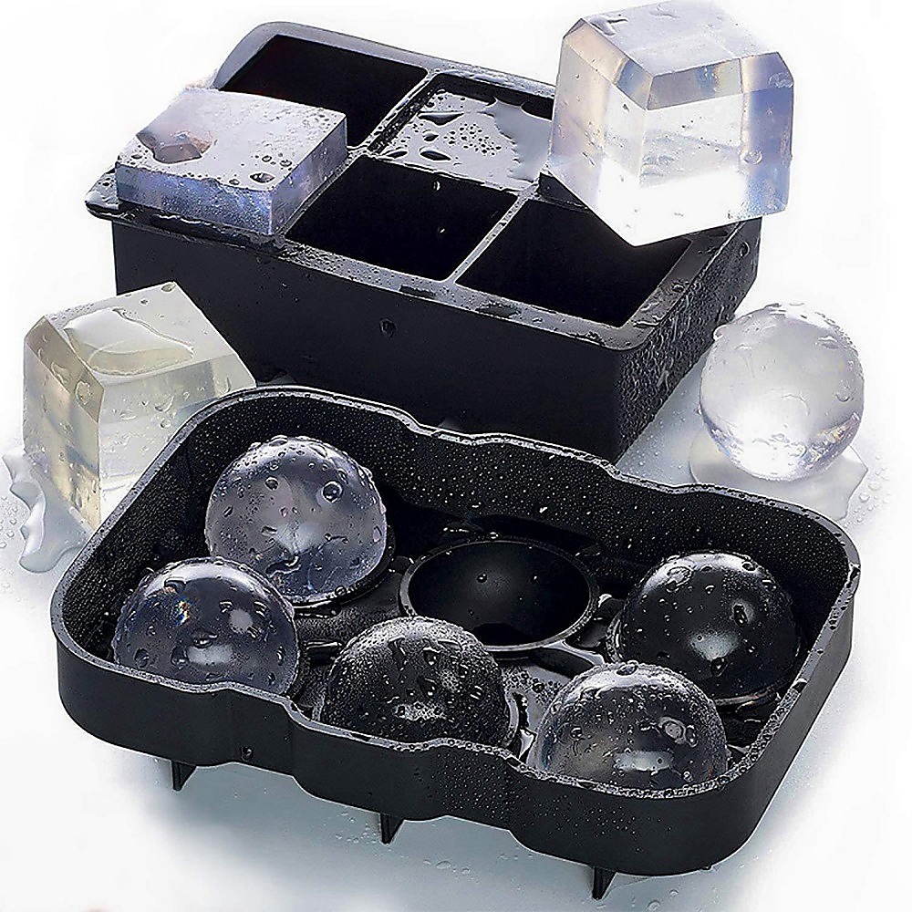 The ice ball tray creates six large 4.3cm ice balls, perfect for whiskey, cocktails, tea, coffee, milk, champagne, and brandy. The square ice cube tray makes six giant 5cm cubes, ideal for Scotch whiskey, bourbon, blended whiskey, and cooling cocktail glasses.