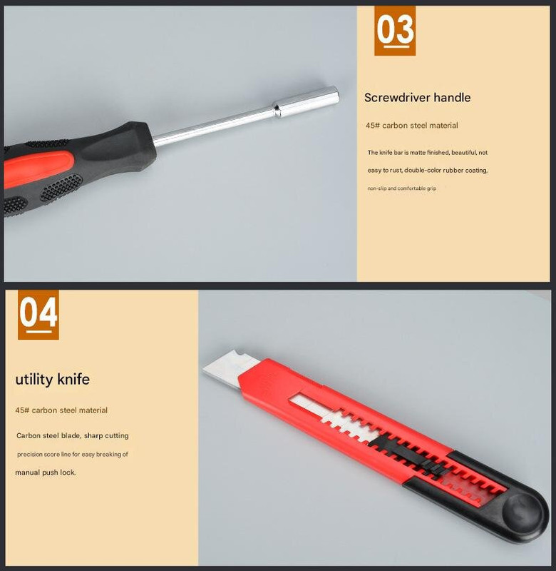 • 39 Essential Tools: Includes 8pcs hexagon socket, 20pcs screwdriver bits, 4pcs precision screwdrivers, 1pc screwdriver handle, 1pc 6-inch carp pliers, 1pc extension rod, 1pc utility knife, 1pc 8oz claw hammer, 1pc 8-inch scissors, 1pc 3m measuring tape.