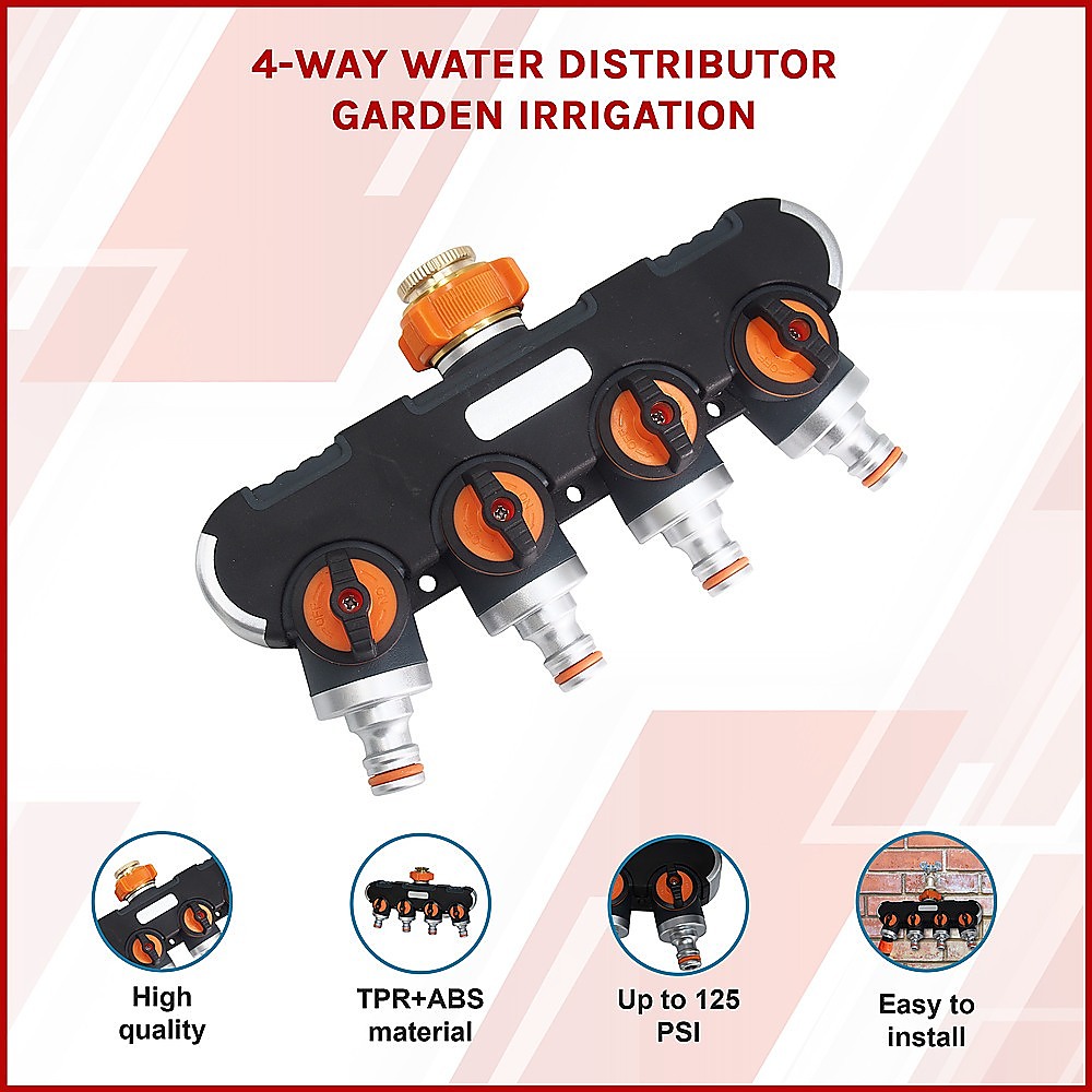 Constructed from high-quality TPR+ABS (thermoplastic rubber and acrylonitrile butadiene styrene) material with an aluminium alloy nut, our four-way water distributor is built tough for Australian conditions, ensuring durability and a lengthy service life. Engineered to prevent leaks and maintain high water pressure when sealed, it's a reliable choice for your outdoor watering needs.
