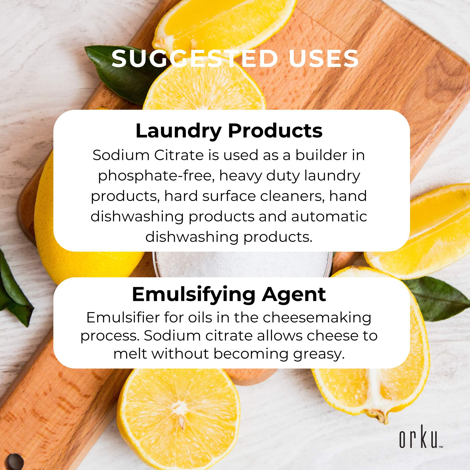 Sodium Citrate is used as a builder in phosphate-free, heavy duty laundry products, hard surface cleaners, hand dishwashing products and automatic dishwashing products.Â