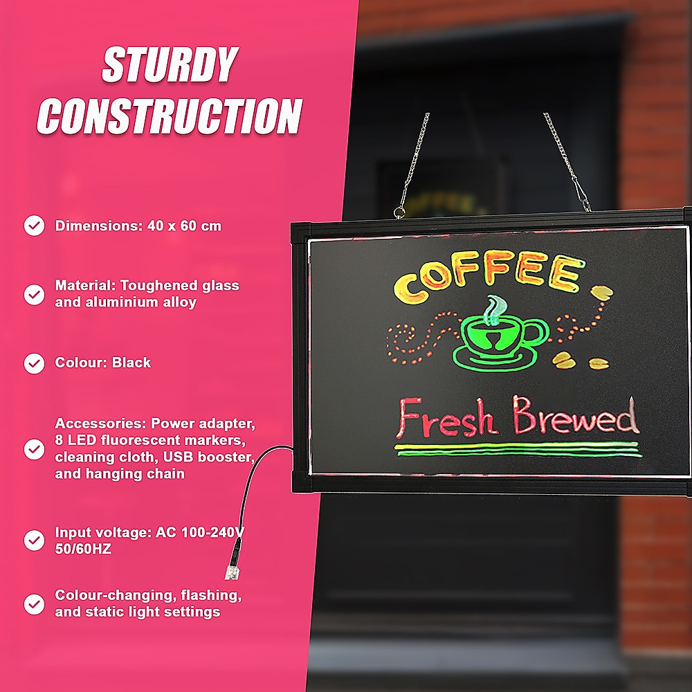 Your child will have so much fun with this LED writing and drawing board that she won't even realise that she's learning! This light-up board by Randy Travis Machinery provides your child with hours of play. The first time your child sees his drawings and pictures light up, he'll think it's sheer magic. With several modes of lighting colour-changing, static, or flashing this board has possibilities well beyond a child's toy. Restaurants can use it to attract attention to their special of the day, retailers can set it up in their shop windows to announce a flash sale, and adults can use it as a relaxing, creative way to relieve stress at the end of a tough day. Executives, teachers, and salespersons can even use it as a colourful visual aid when they give presentations.