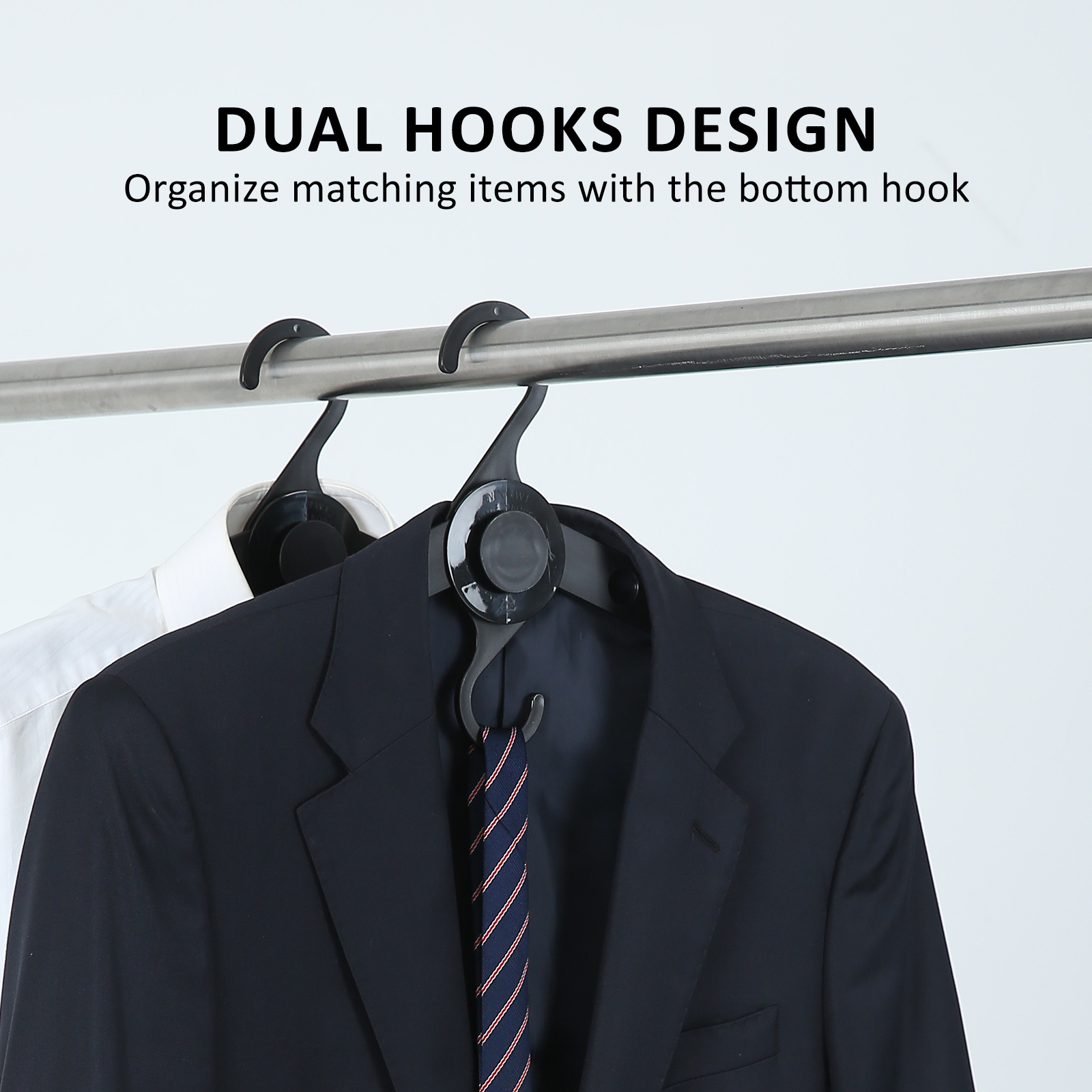 DUAL HOOK DESIGN: One at the top to hang in the closet or on a rack, the other at the bottom to add additional items.