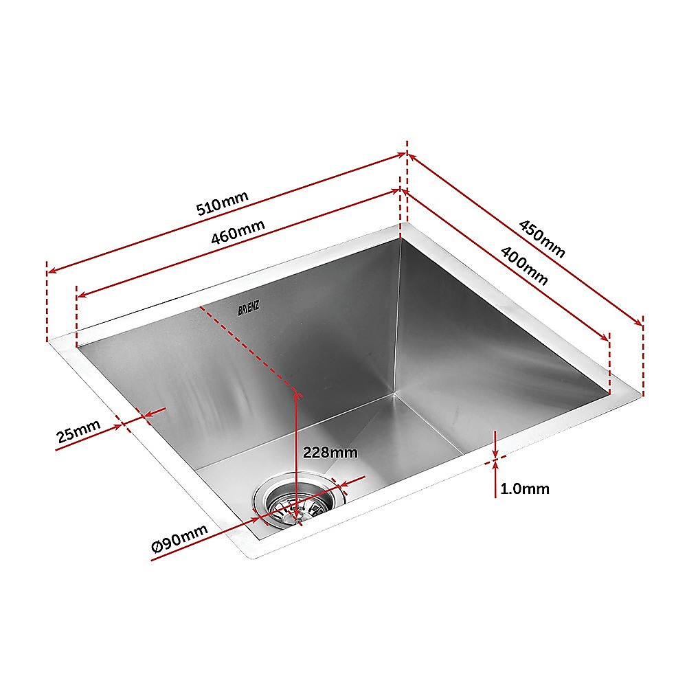 This single sink is made from hand-made 1.0mm-thick Type 304 stainless steel for a brilliant look that will last and last. It measures 510 x 450 x 228mm (L x W x D) with a 90mm drain opening and an above-average depth for added versatility. A strainer waste is included. Installation is either Undermount / Topmount-style. Undermount / Topmount brackets are included along with full installation instructions.
