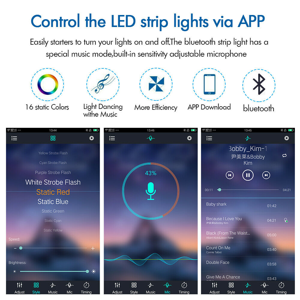 Built-in high sensitivity mic, spectrum with light and colors adjusting automatically base on the ambient sound, lights follow the music and mic. Allow you to changing the light with 16 million different colors. And every color is dimmable.