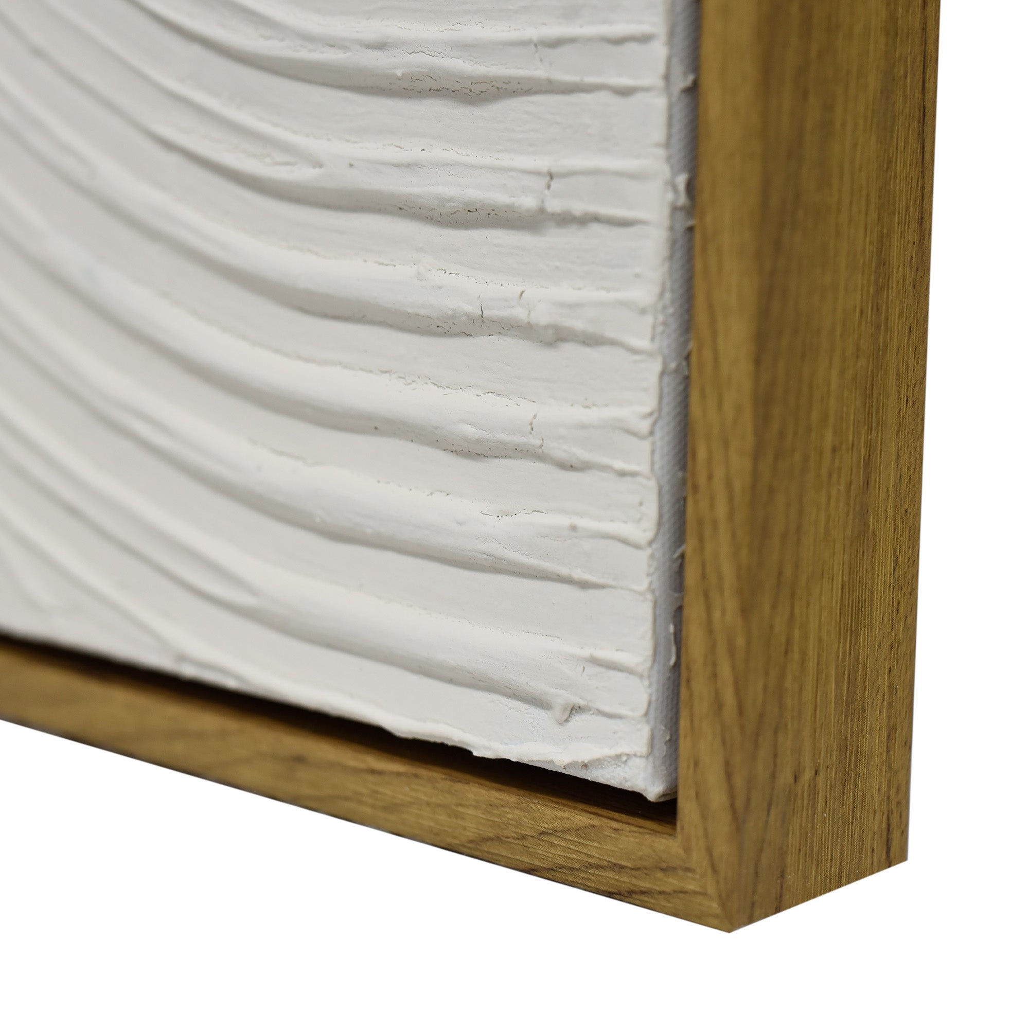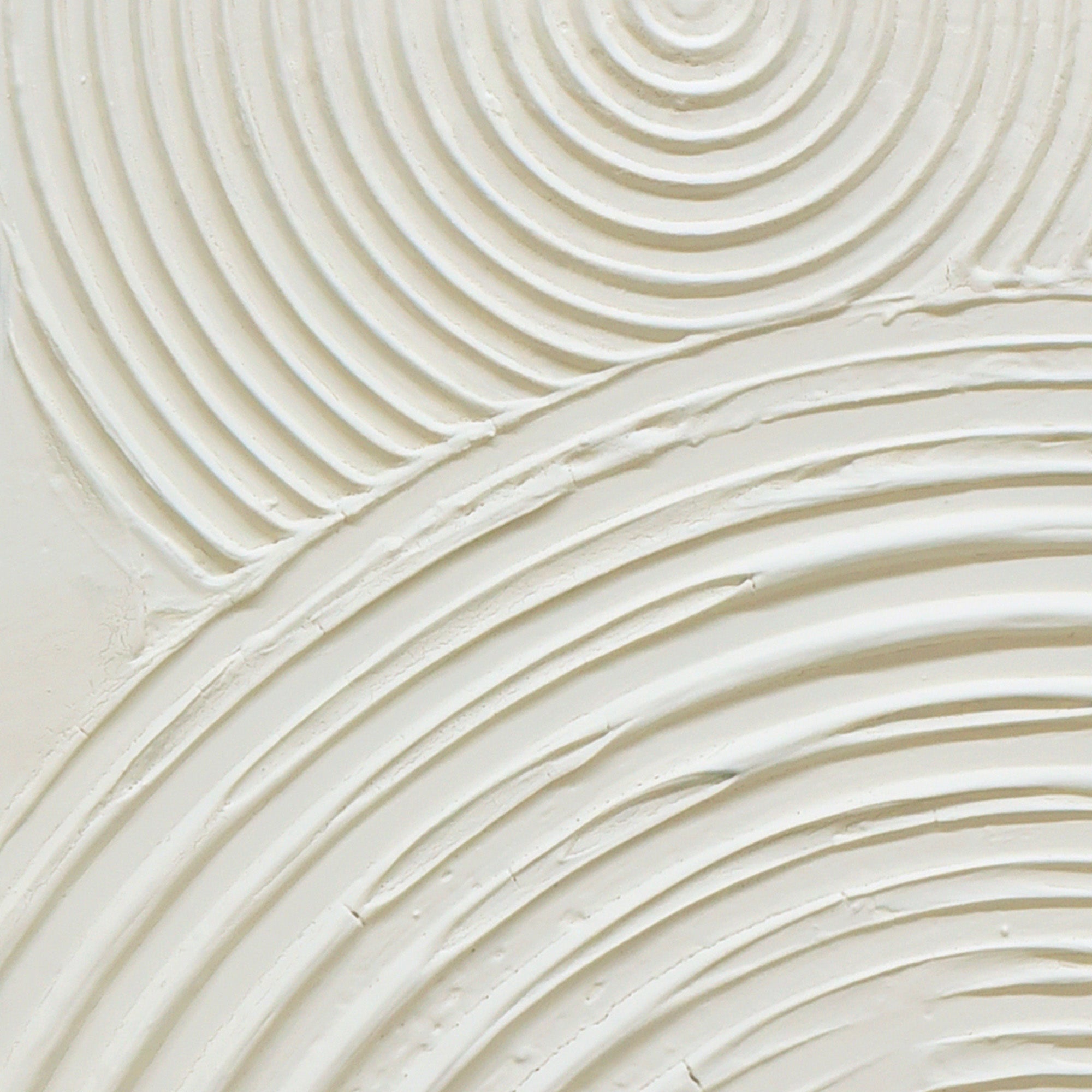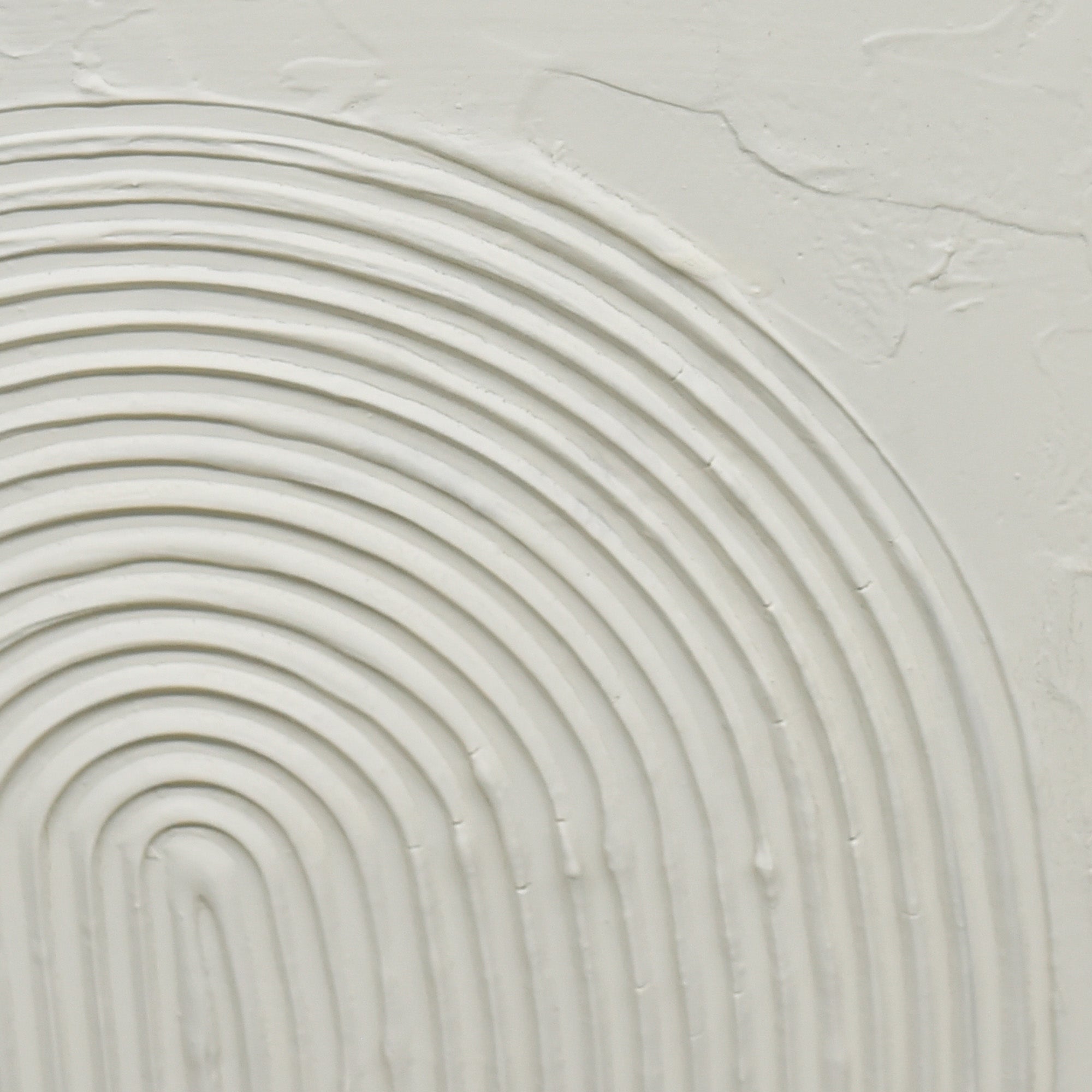 Nestled within a sophisticated dark wood frame, “Ephemeral Echoes of Continuity” presents itself as a 60cm x 90cm hand-painted tableau of texture and form. With its palpable white palette, the thick texture becomes a canvas for shadow and light to play, bringing the artwork to life. Carved delicately into this white expanse are a series of grooves: two U-shaped markings—one arching skyward and the other grounding downward—both suggesting cyclical movement and balance. Further complementing this dance of shapes are two concentric grooves, a demure half-circle and a subtle quarter-circle, reminding viewers of the moon’s phases or the eternal cycles of nature. “Ephemeral Echoes of Continuity” is not just a visual experience but a tactile journey, beckoning one to reflect on the rhythms of life and the delicate balance of existence.