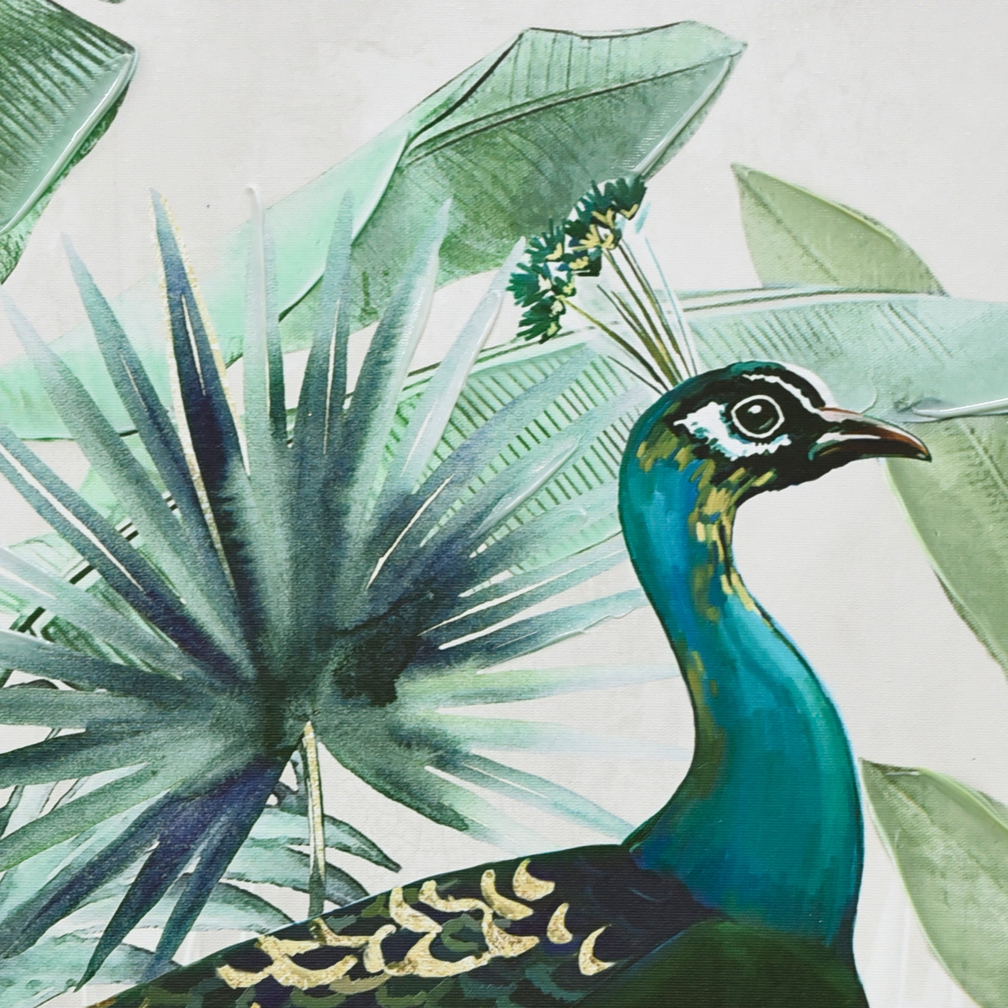“Golden Plume” is a vibrant celebration of nature’s beauty and artistry. At its heart lies a magnificent peacock, its vibrant hues and intricate patterns capturing the essence of this regal bird. Surrounded by abstract florals and leaves, the peacock stands as a beacon of elegance and grandeur. What truly elevates this piece is the meticulous gold accentuation, especially on the peacock’s feathers, adding a touch of opulence and making the bird shimmer with every play of light. The artwork is a harmonious blend of hand-painted elements and print, ensuring that every detail is accentuated. Encased in a dark wood frame, “Golden Plume” beckons viewers to delve into the intricacies of the design and appreciate the mesmerizing dance of colors and patterns.