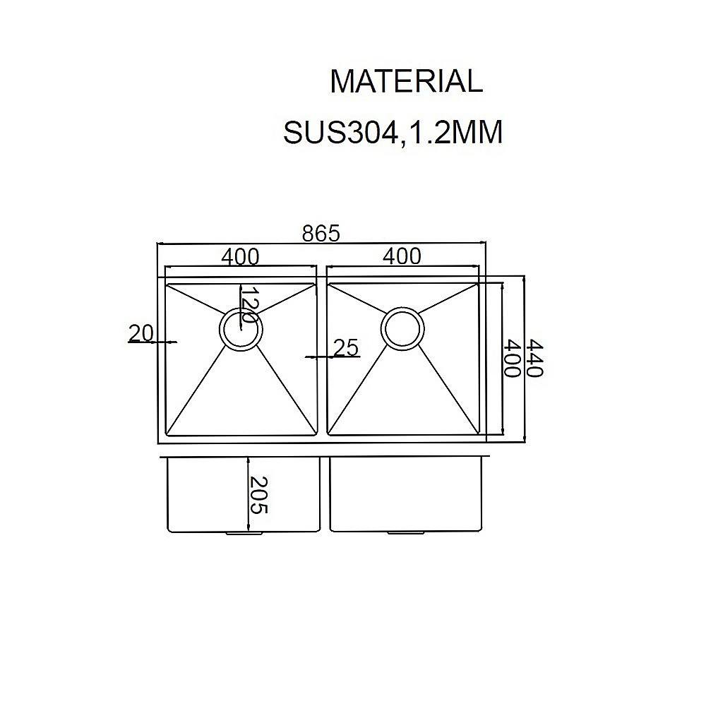This double sink is made from 1.2mm-thick Type 304 stainless steel with a satin finish for a brilliant look that will last and last. It measures 865 x 440 x 205mm (L x W x D) with 90mm drain openings. Two strainer wastes are included. Sinks are equally sized at 400 x 400mm. Installation is Undermount / Topmount-style.