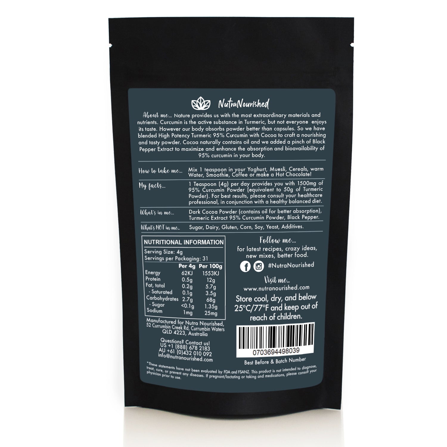 - 95% Curcumin Powder extracted from the Turmeric Root with Cocoa Flavour