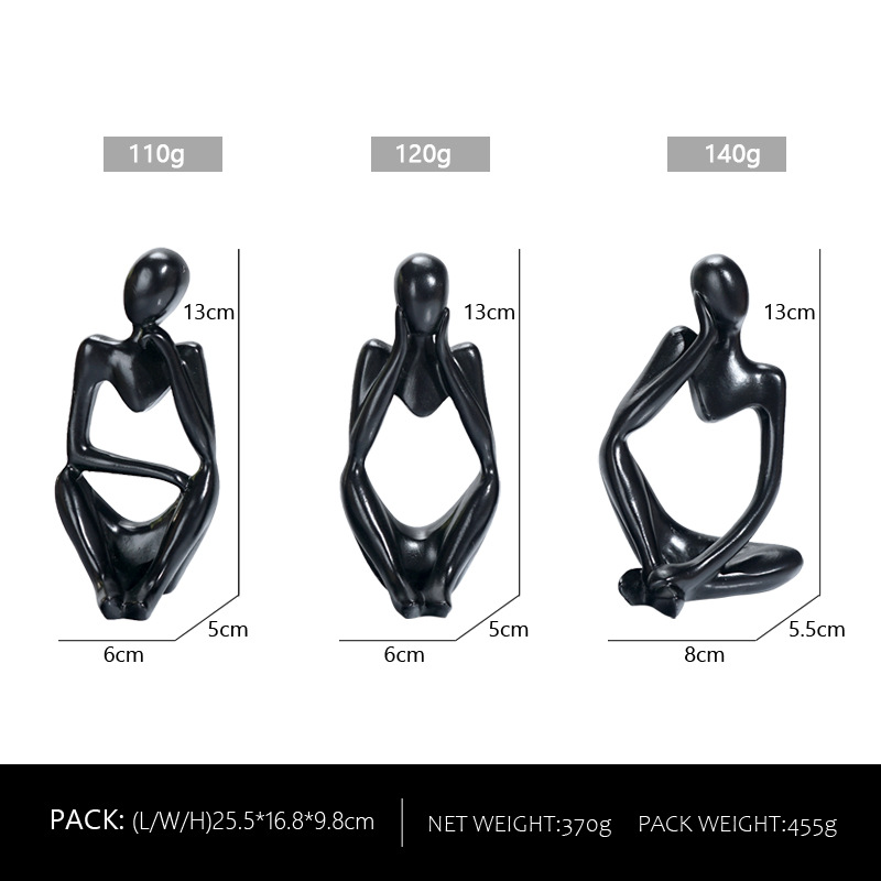 Abstract Thinker Sculpture Set – Elevate your home decor with this striking set of abstract thinker sculptures in a black finish. Crafted from high-quality resin, these modern art figurines depict thought-provoking poses, perfect for adding a touch of sophistication to any room. Each piece measures 13cm (5.1in) in height, with individual weights of 110g, 120g, and 140g. Ideal for living rooms, offices, or study spaces, this set brings an artistic flair to your decor.