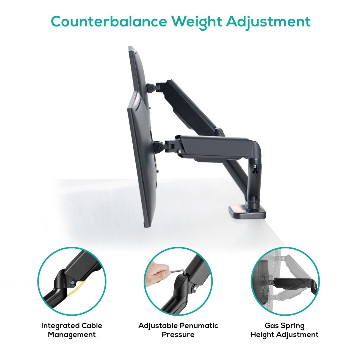 - Gas Spring: perfectly counterbalances the weight of your monitor.