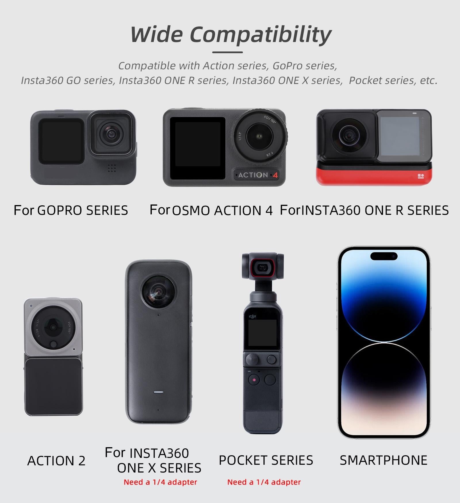 • Widely compatible and can be used with a variety of action cameras, suitable for GoPro series, Insta360 GO series, Action series, Insta360 ONE R series, Insta360 ONE X series, Pocket series, etc…