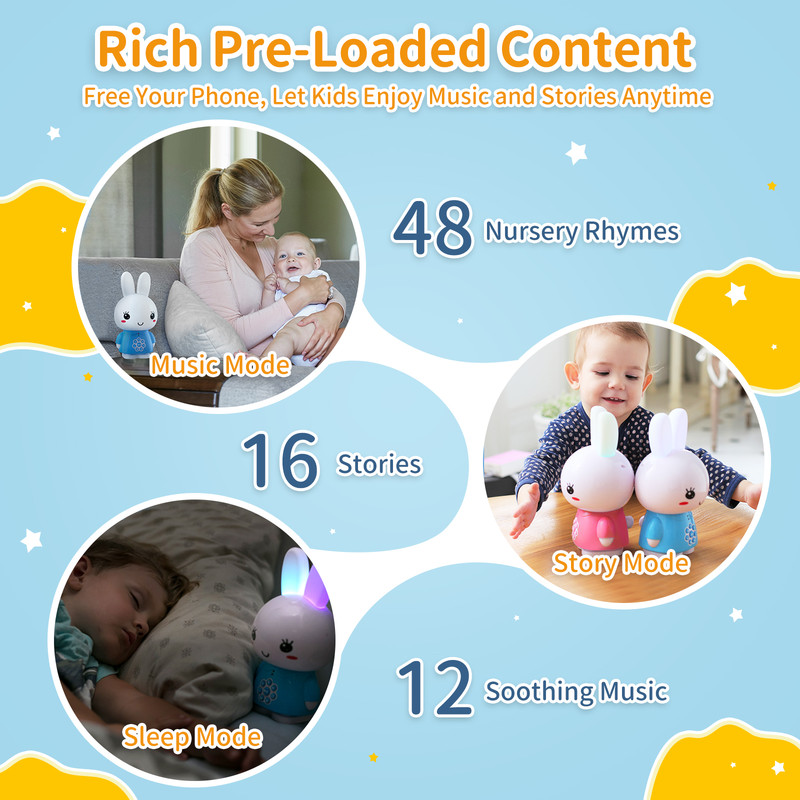 - ✨【 Screen-Free Audio Player】Baby musical toy pre-installed with 16 fun stories, 12 soothing lullabies, and 48 nursery rhymes, spreading joy and happiness to children. Non-irritating screen to protect your baby’s eyesight. It promotes your baby’s sensory development and hand-eye coordination.