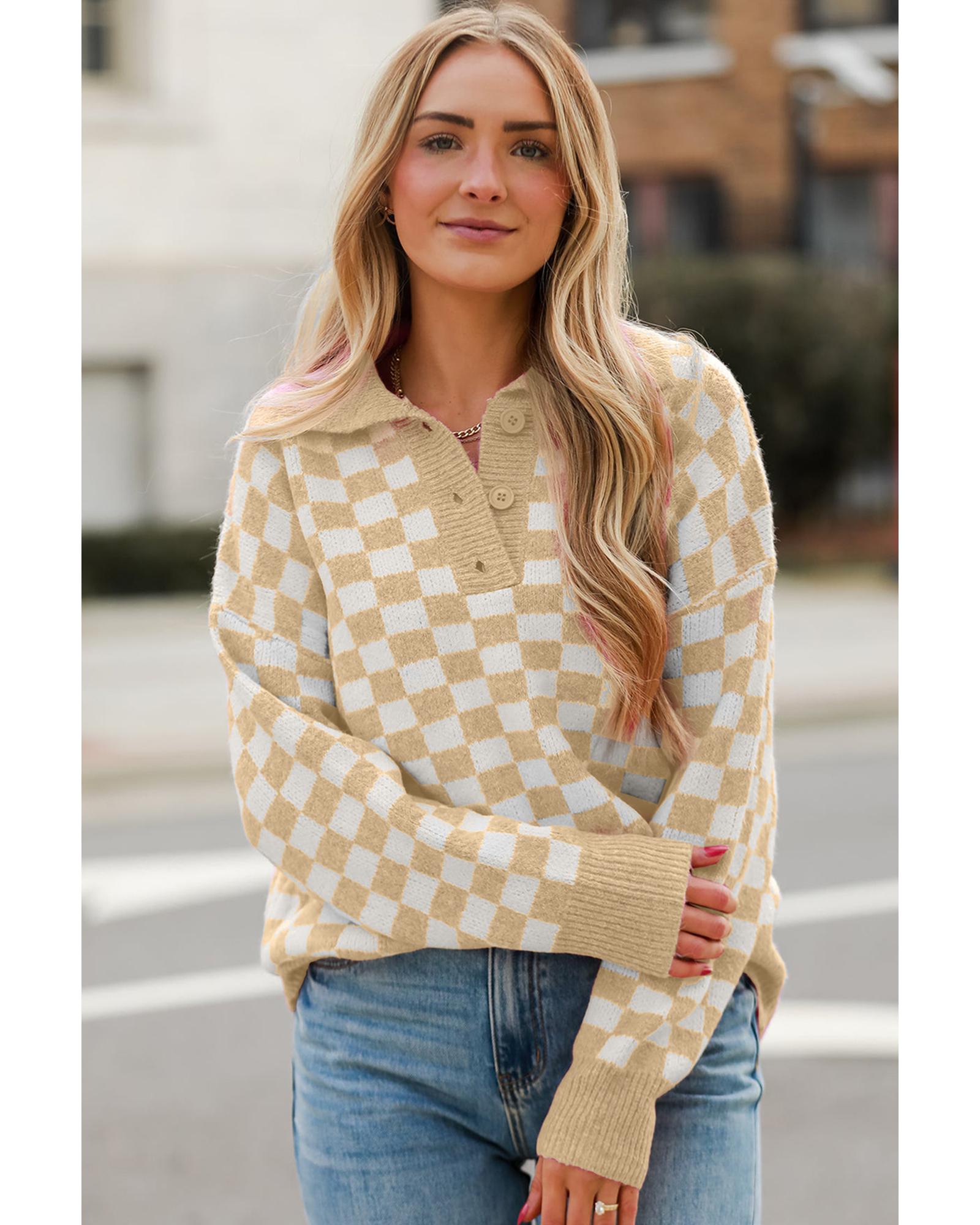 Apricot Checkered Buttons Collar V Neck Drop Shoulder Sweater – S