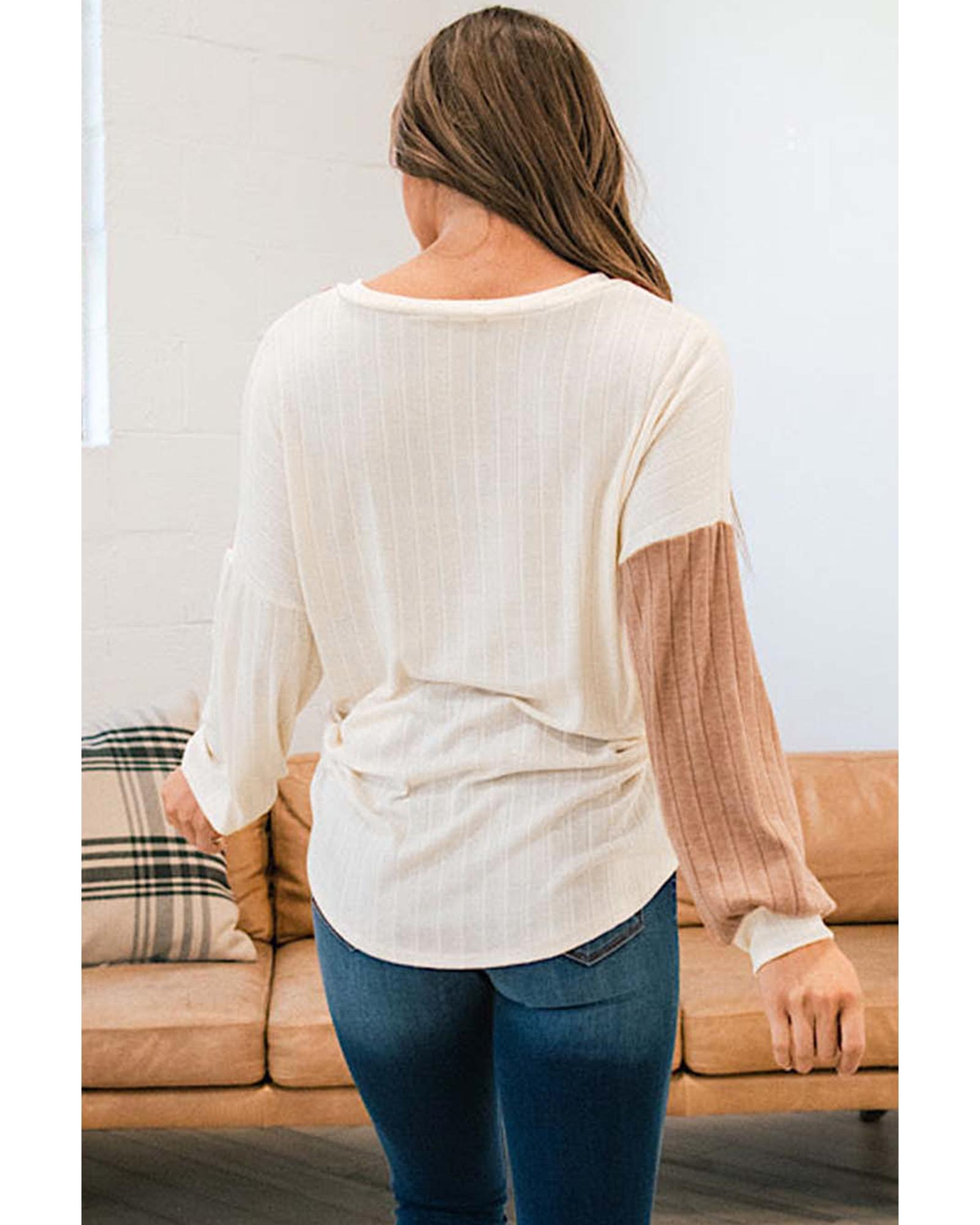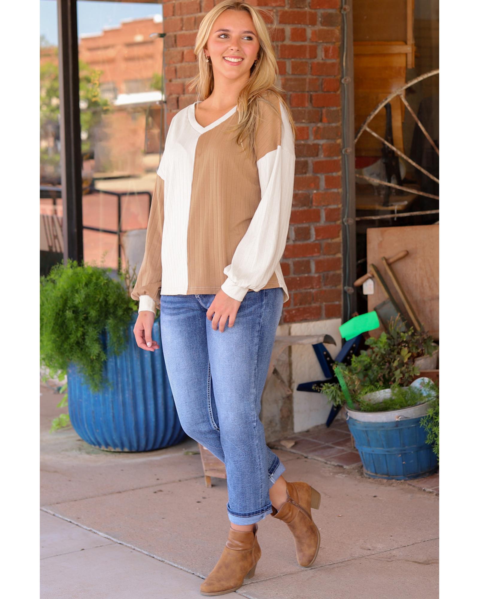 Apricot Color Block Wide Ribbed V Neck Top – L