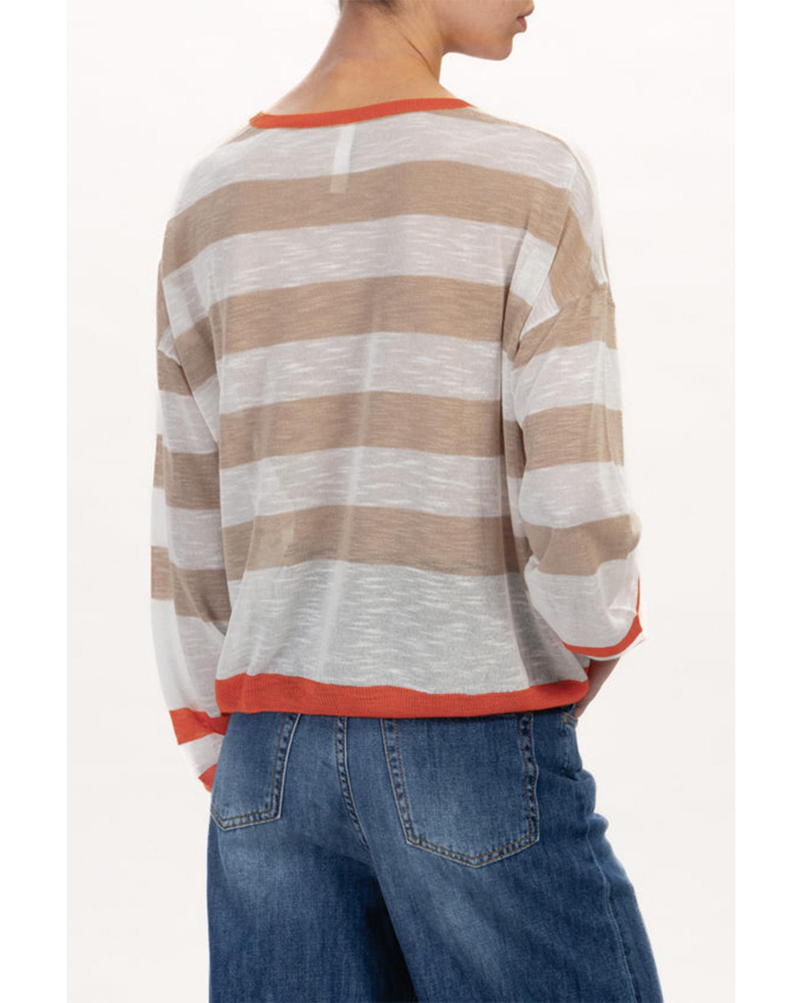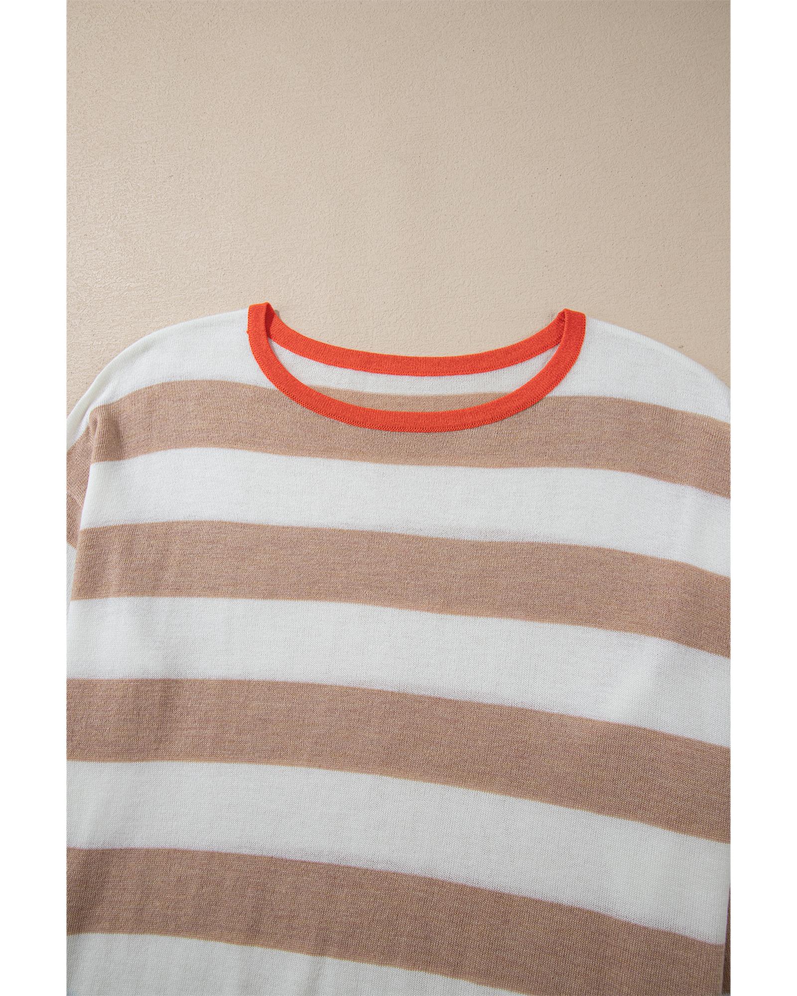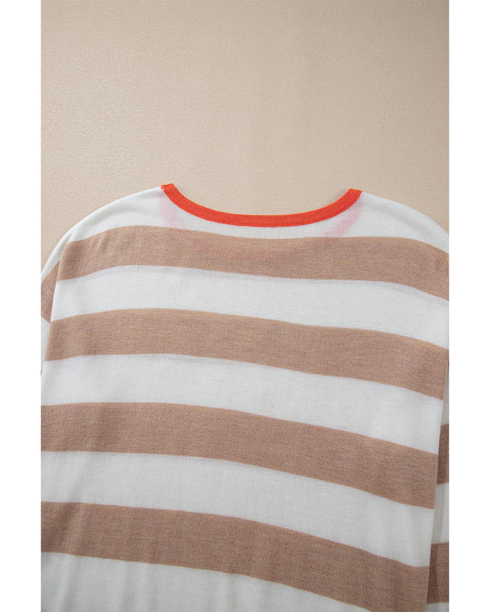 Apricot Colorblock Striped Round Neck Drop Shoulder Sweater – M