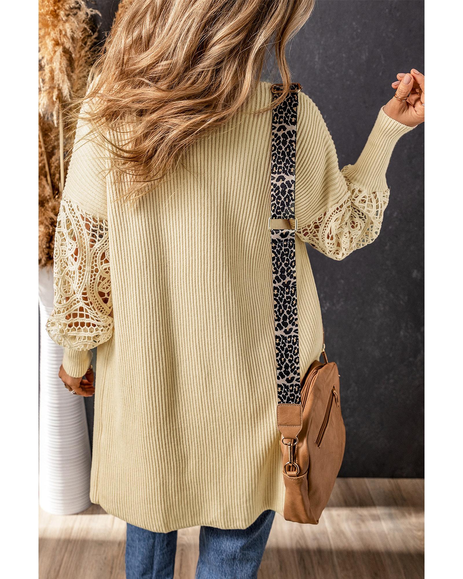 Apricot Crochet Lace Sleeve Ribbed Knit Cardigan – S