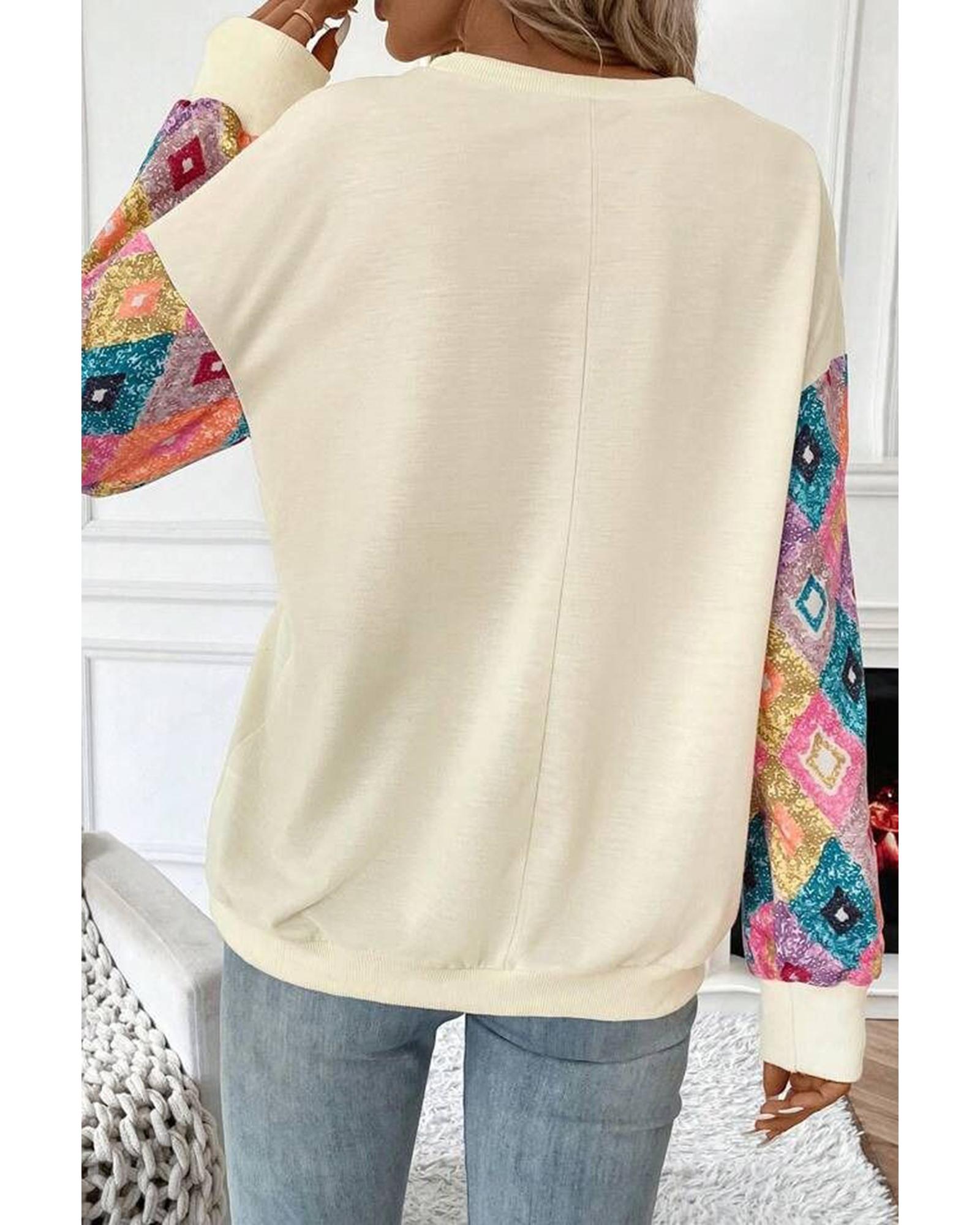 Apricot Geometric Printed Patchwork Long Sleeve Round Neck Top – L