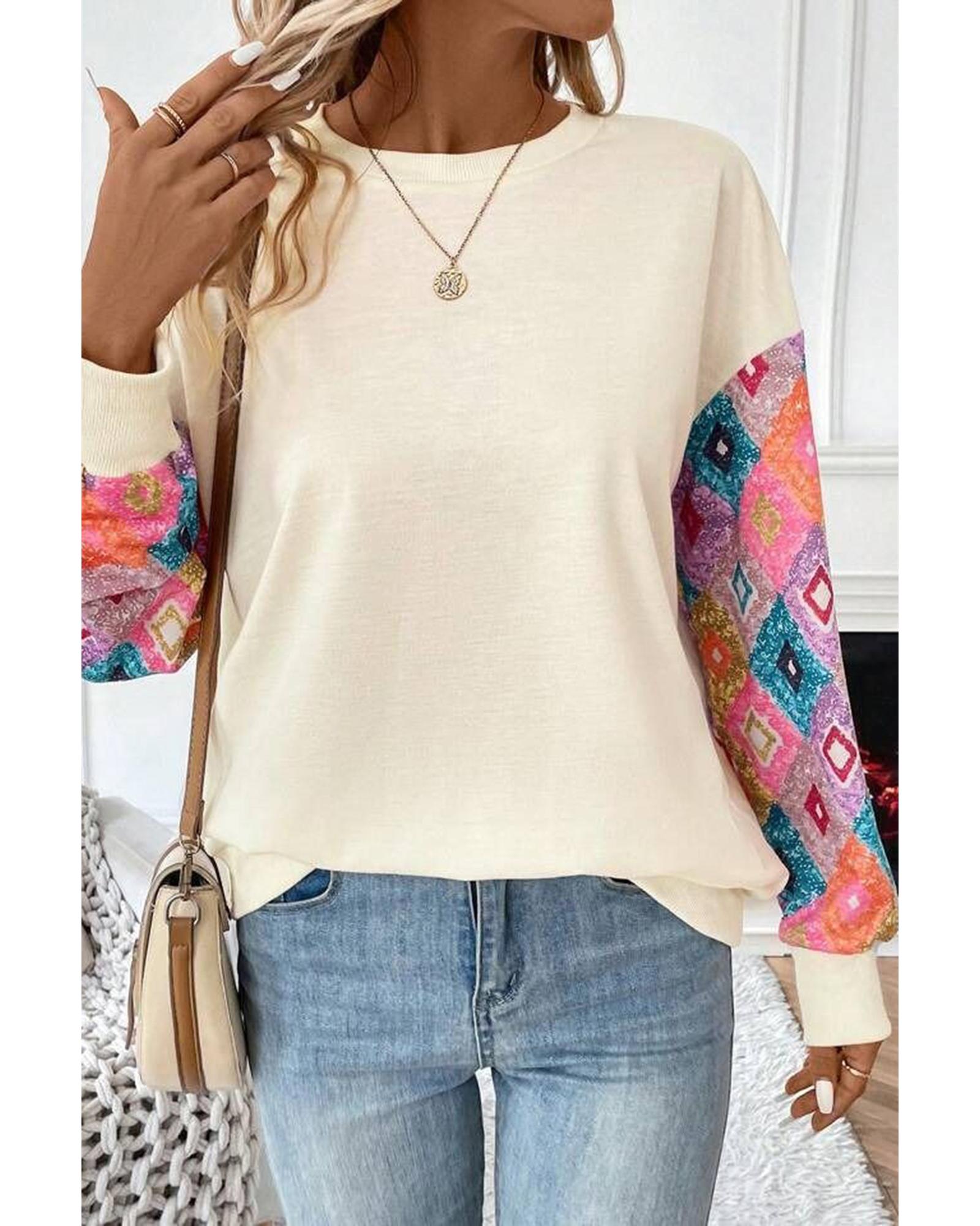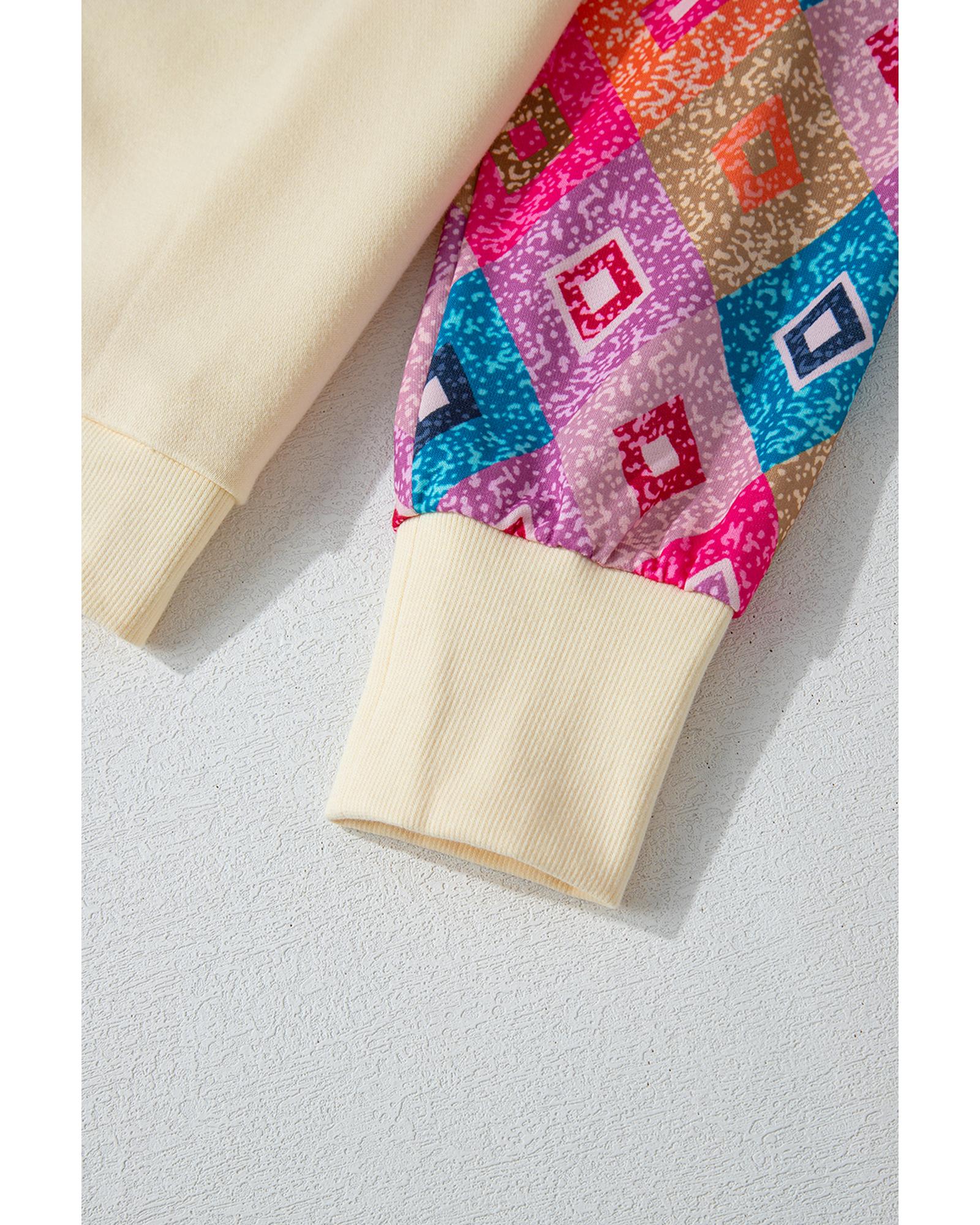 Apricot Geometric Printed Patchwork Long Sleeve Round Neck Top – S