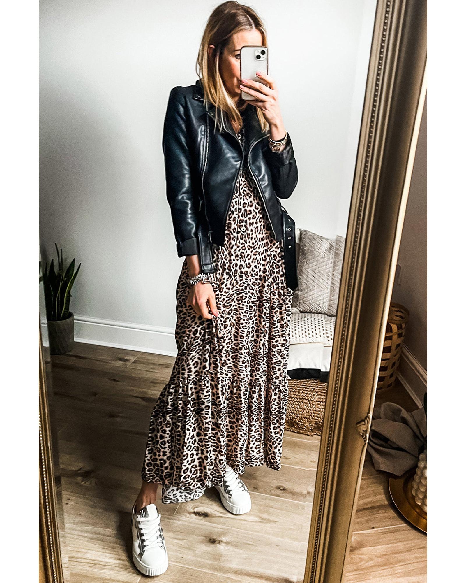 Apricot Leopard Print Tiered Wide Sleeve Maxi Dress – S