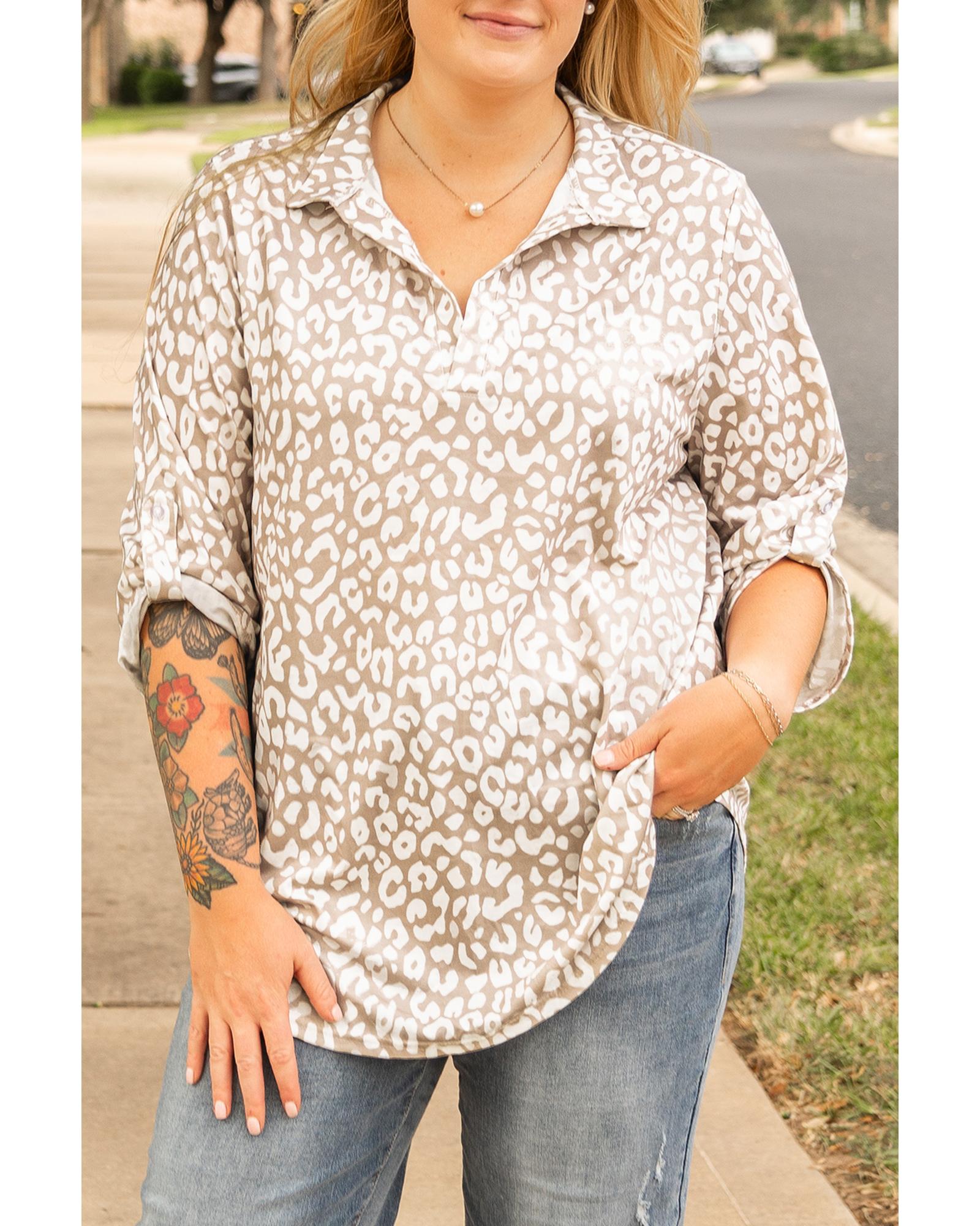 Apricot Leopard Tab Sleeve V Neck Plus Size Top - 1X