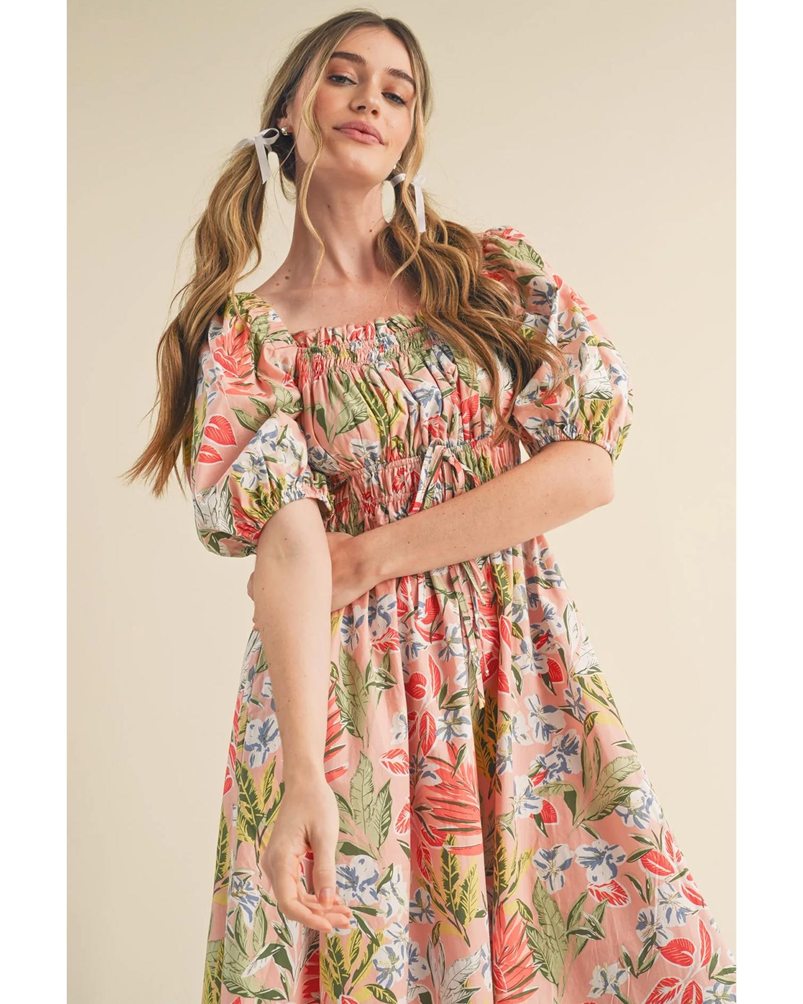 • Apricot Pink Floral Smocked Bust Bubble Short Sleeve Maxi Dress
