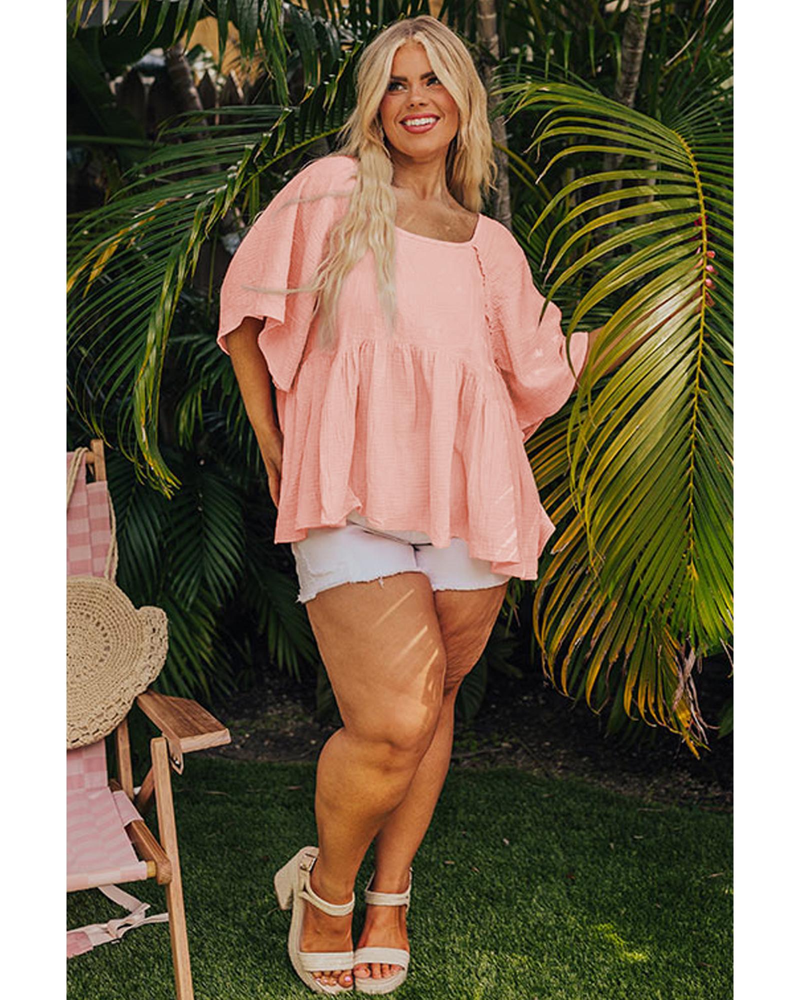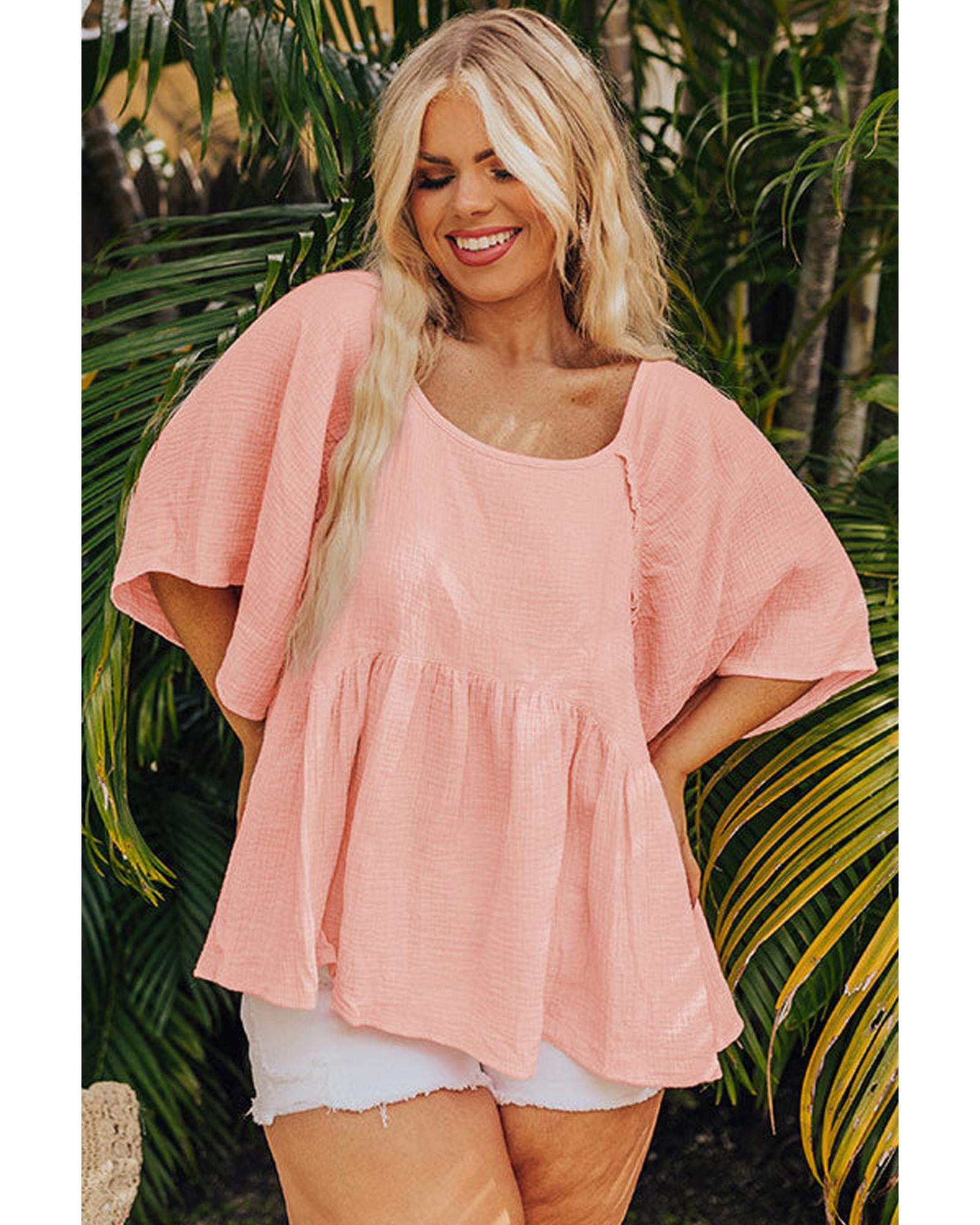 - Apricot Pink Plus Size Textured Wide Short Sleeve Babydoll Blouse