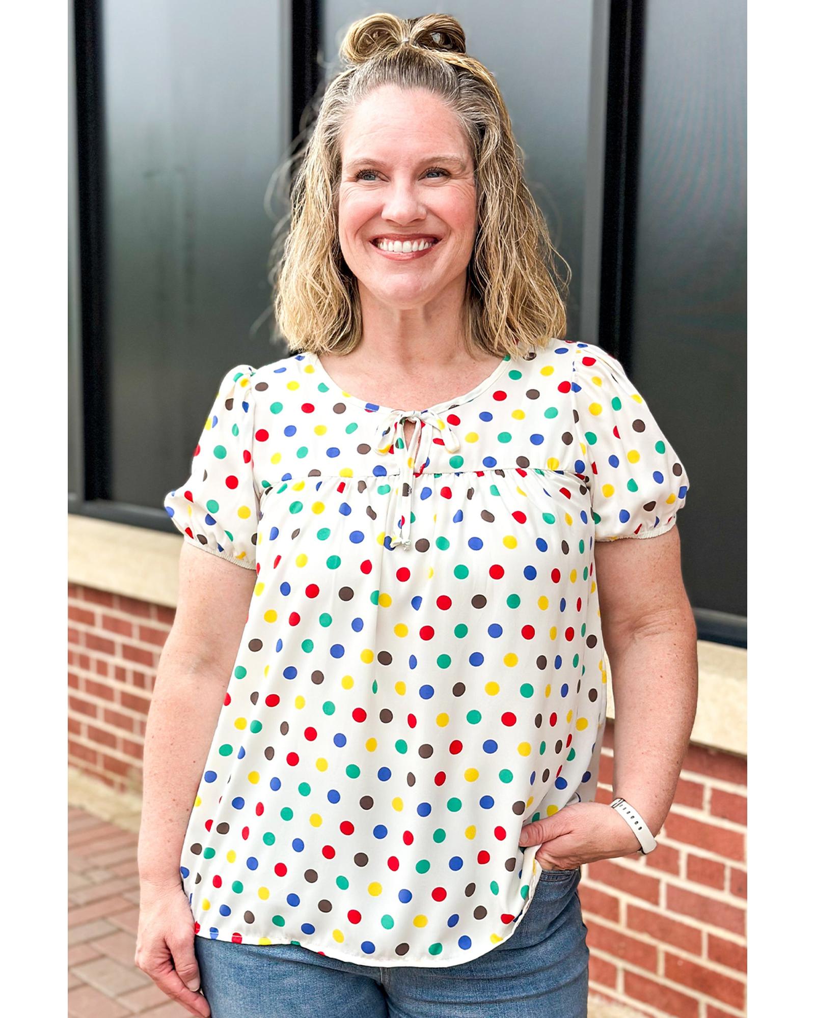 Apricot Plus Size Colorful Polka Dots Tie Neck Puff Sleeve Blouse – 4X