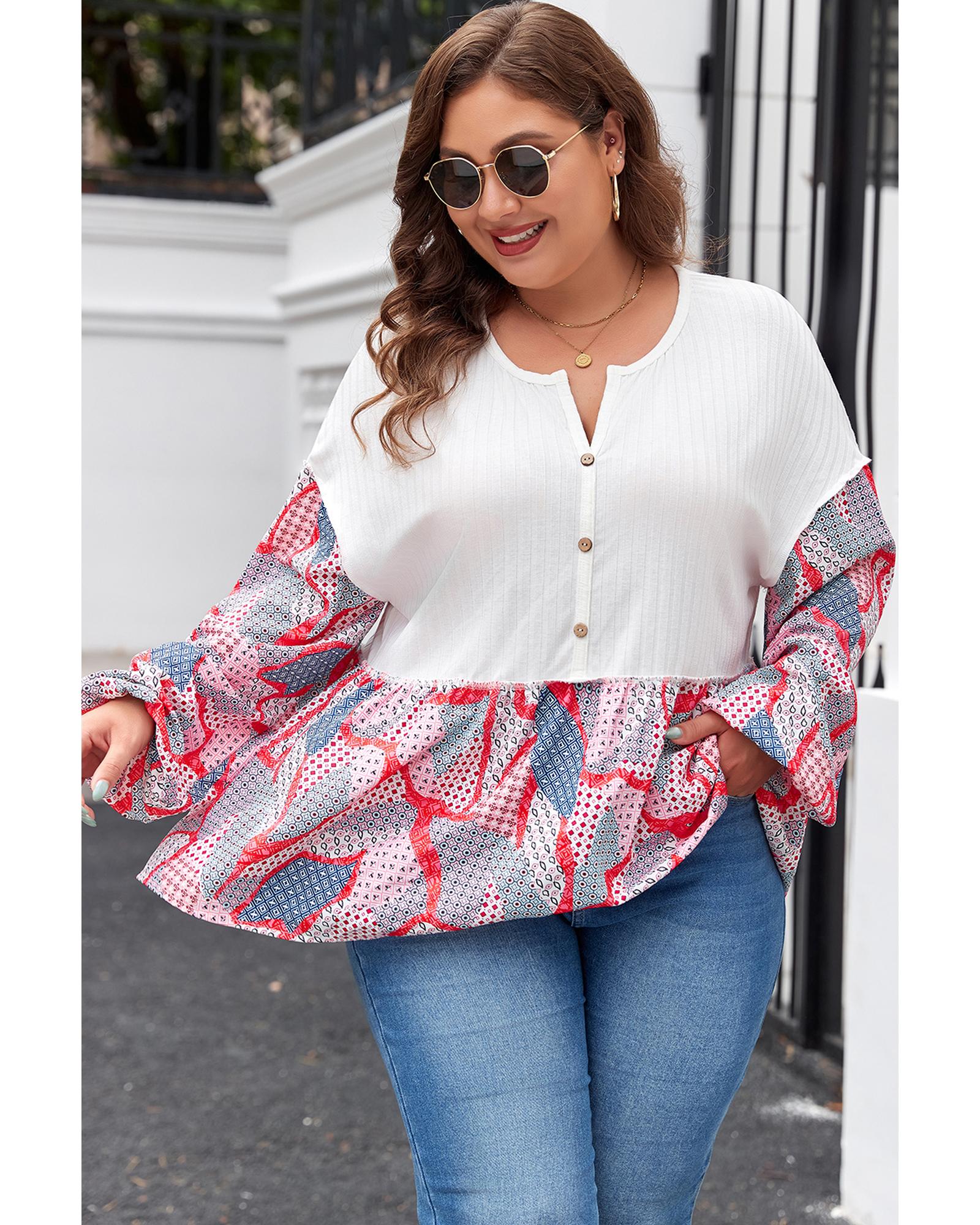 Apricot Plus Size Printed Patchwork Textured Buttoned Blouse – 1X