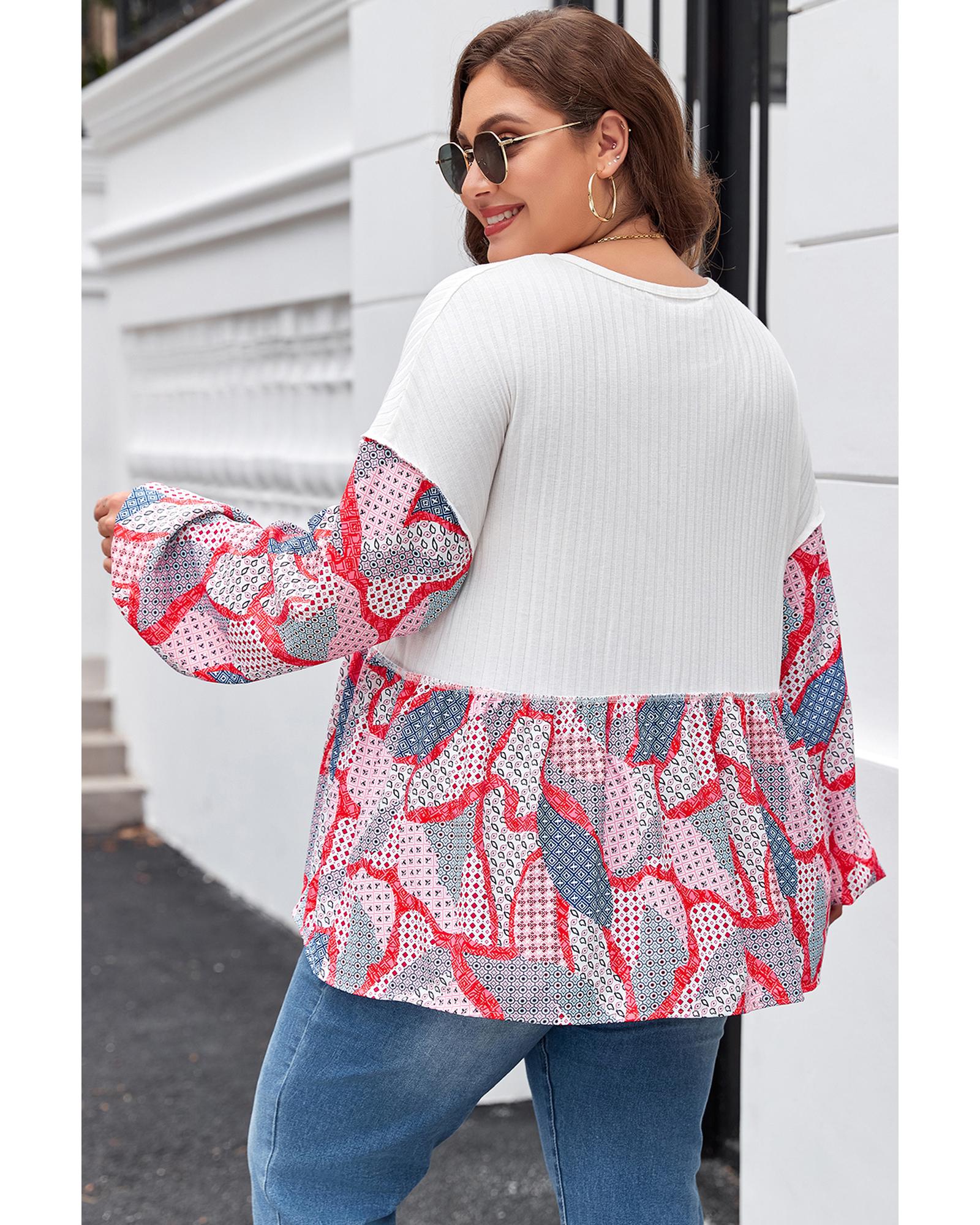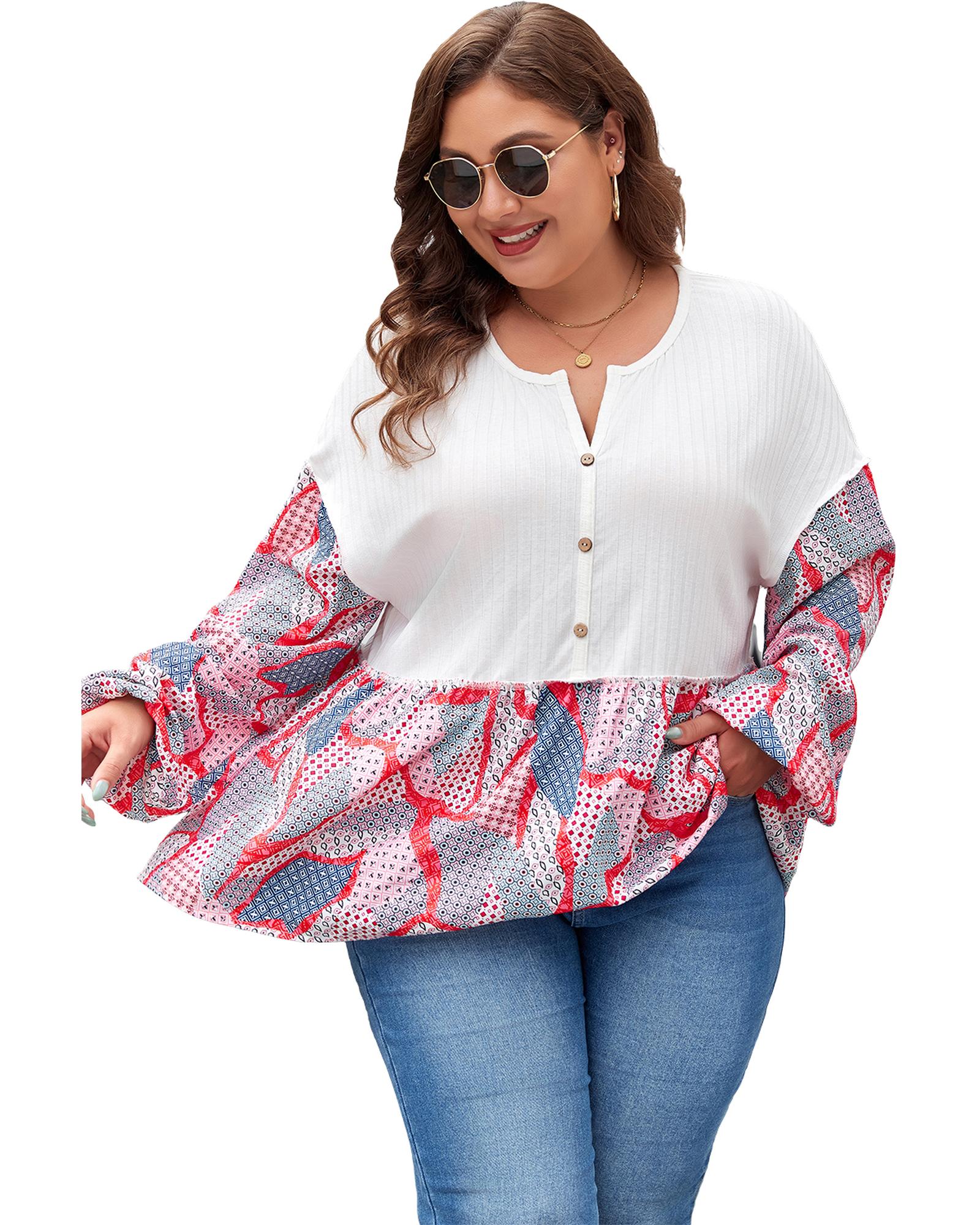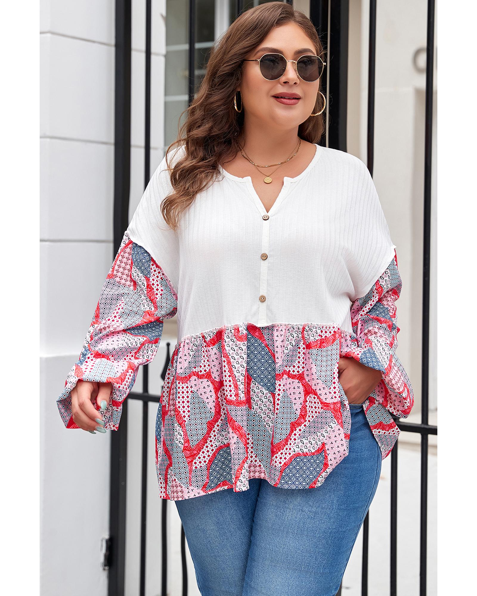 Apricot Plus Size Printed Patchwork Textured Buttoned Blouse – 3X