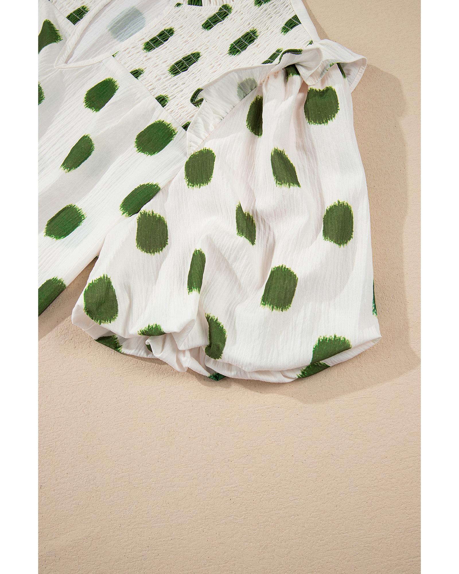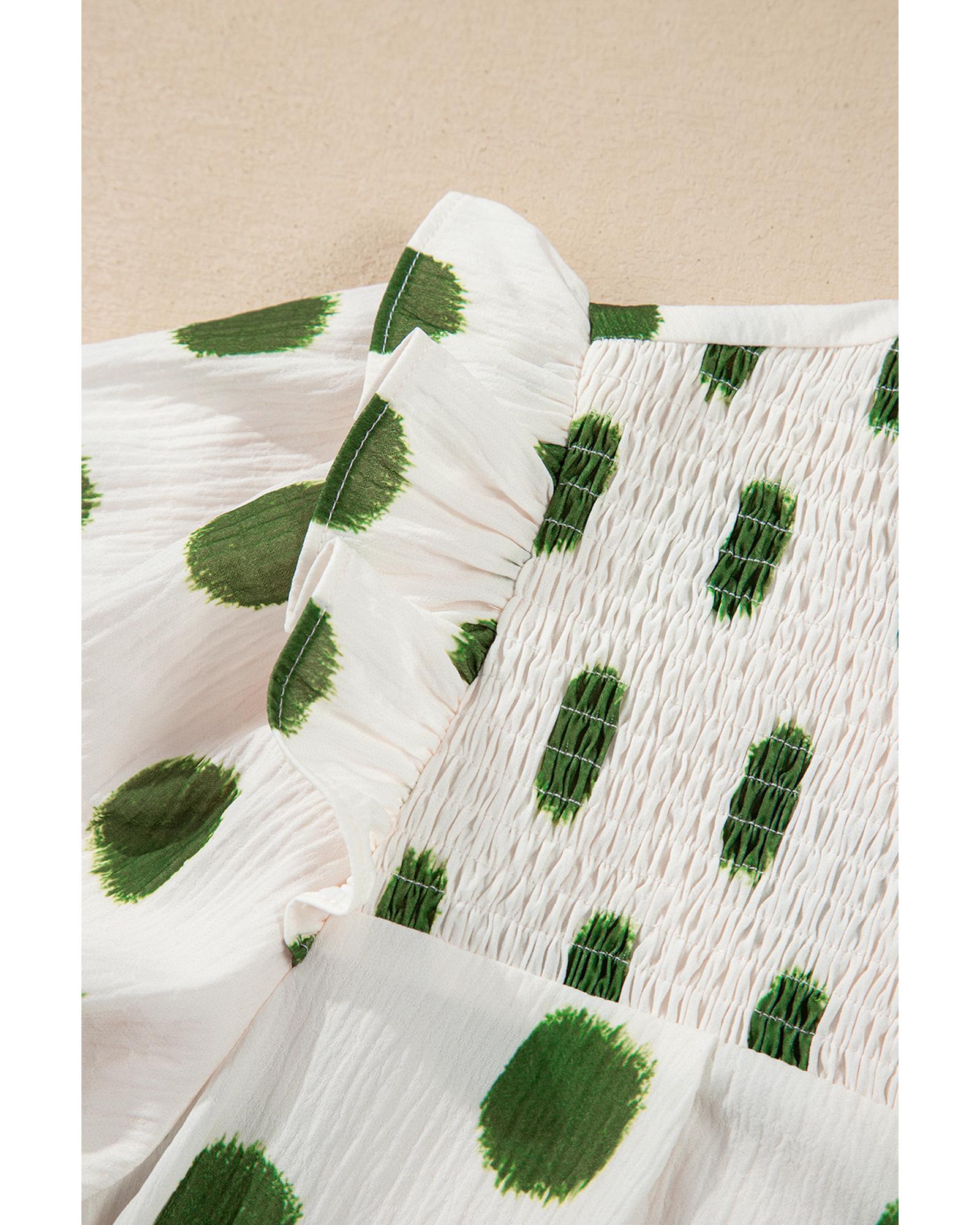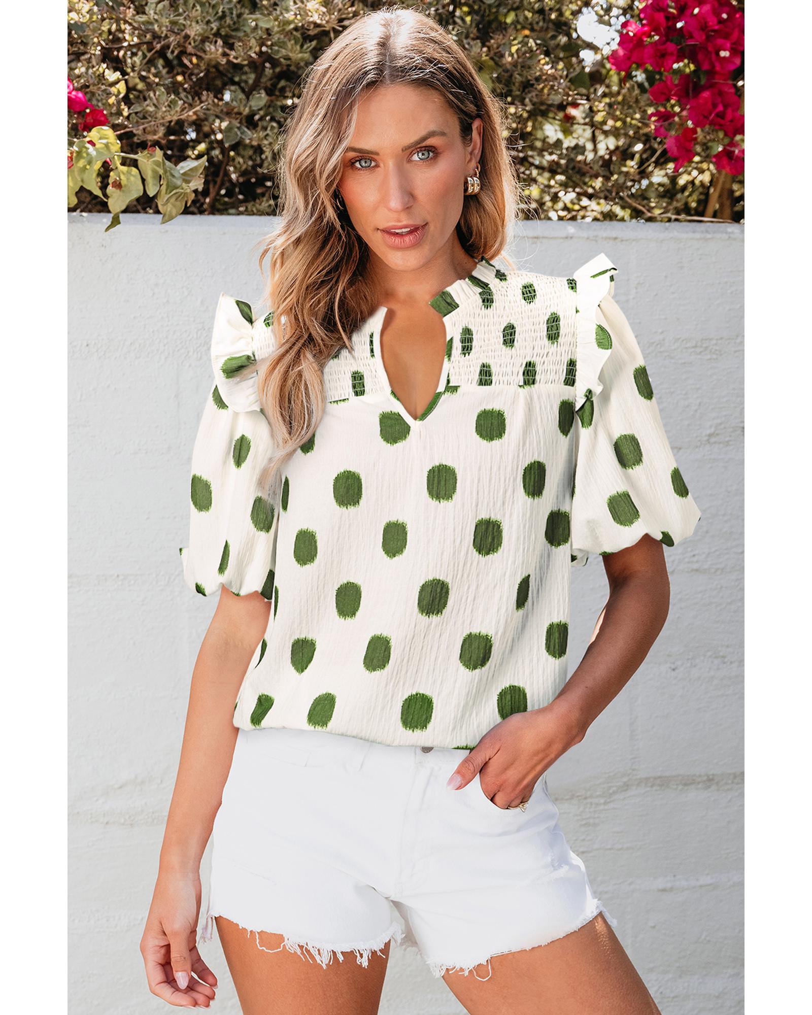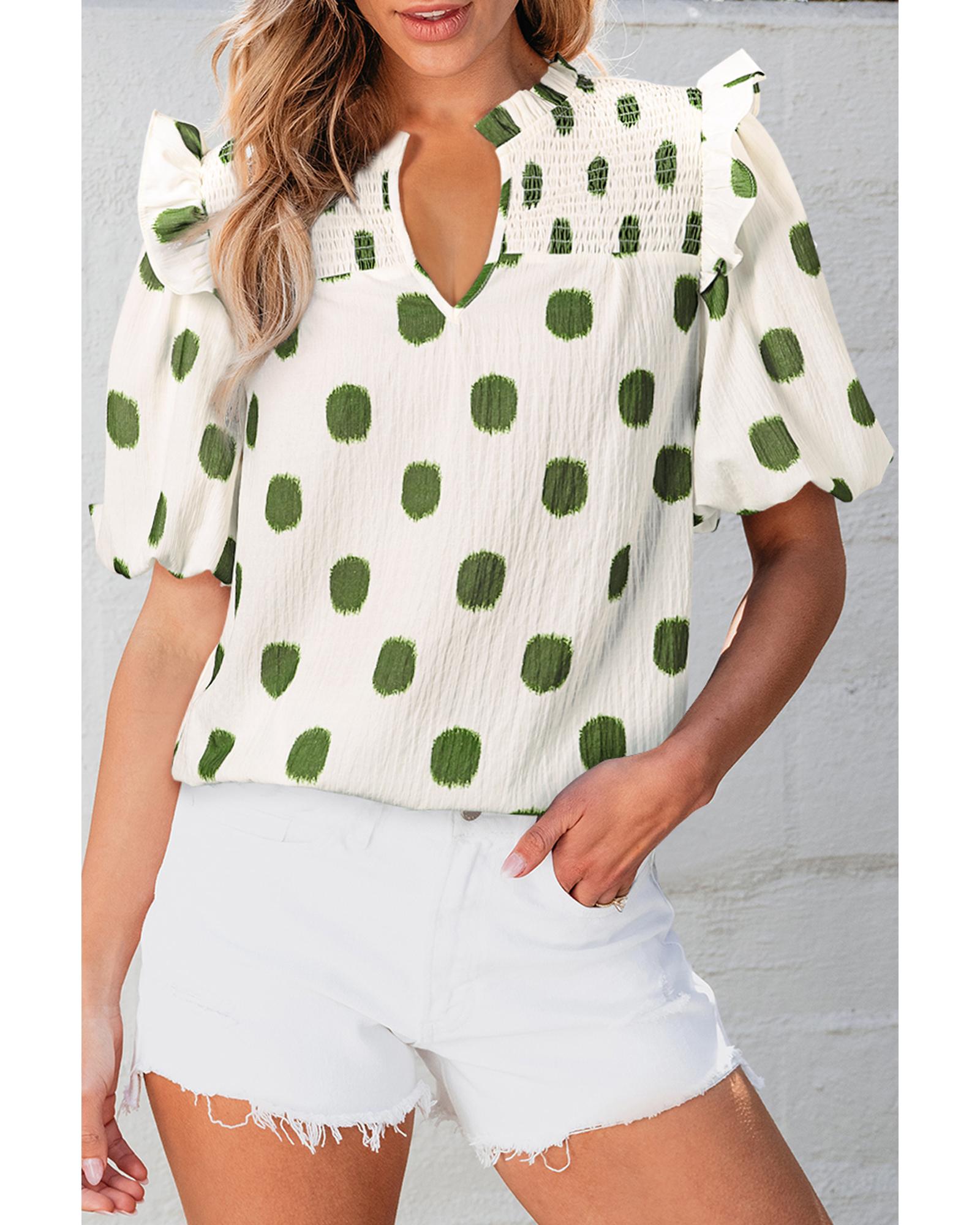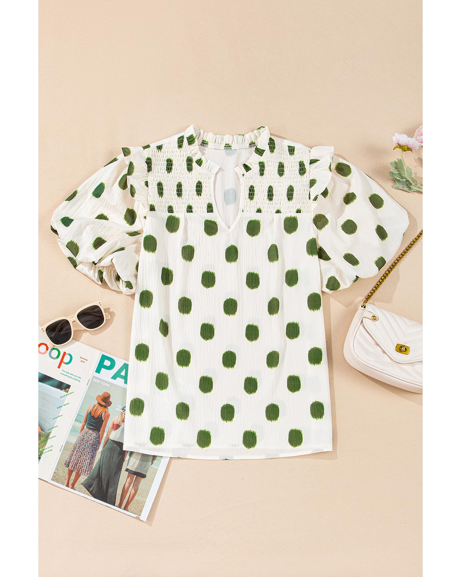 Apricot Polka Dot Print Shirred Yoke Notched Neck Balloon Sleeve Blouse – XL