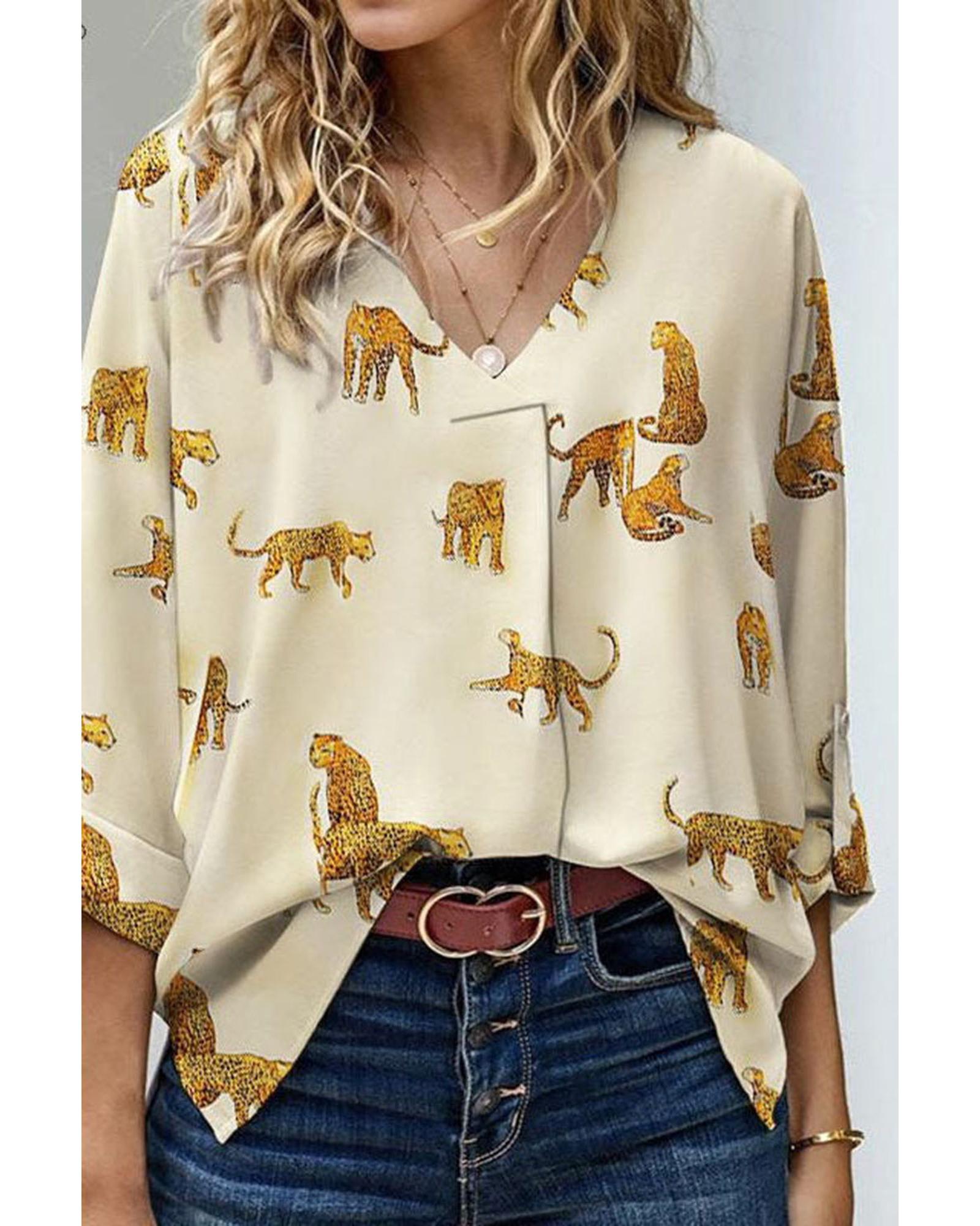- Apricot Printed Leopard Print Tab Sleeve Loose Fit V Neck Blouse