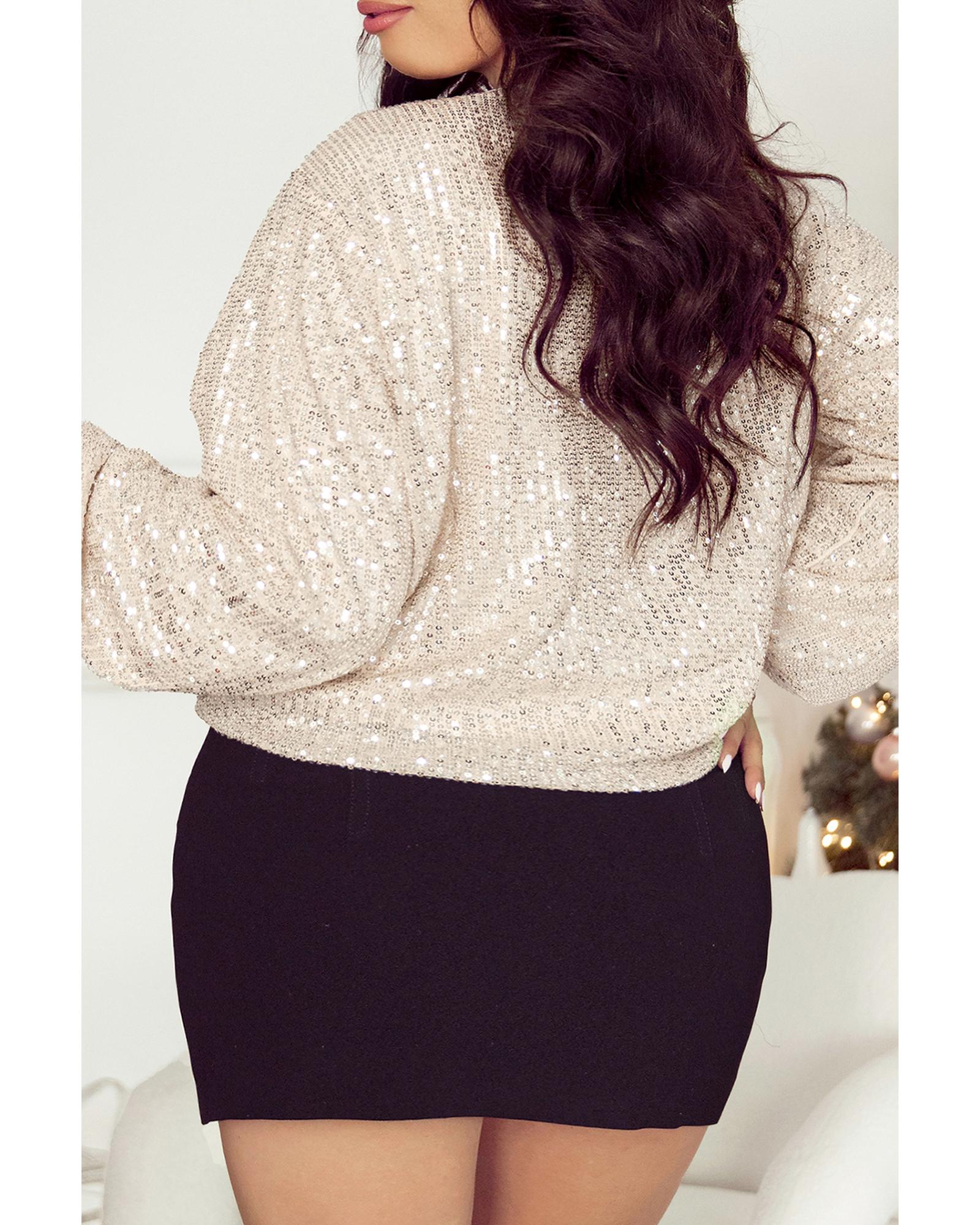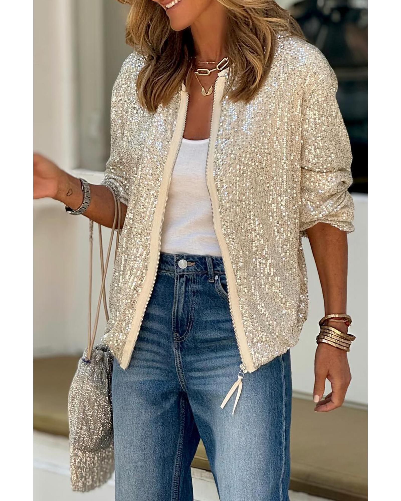 Apricot Sequin Zip up Round Neck Long Sleeve Jacket – S