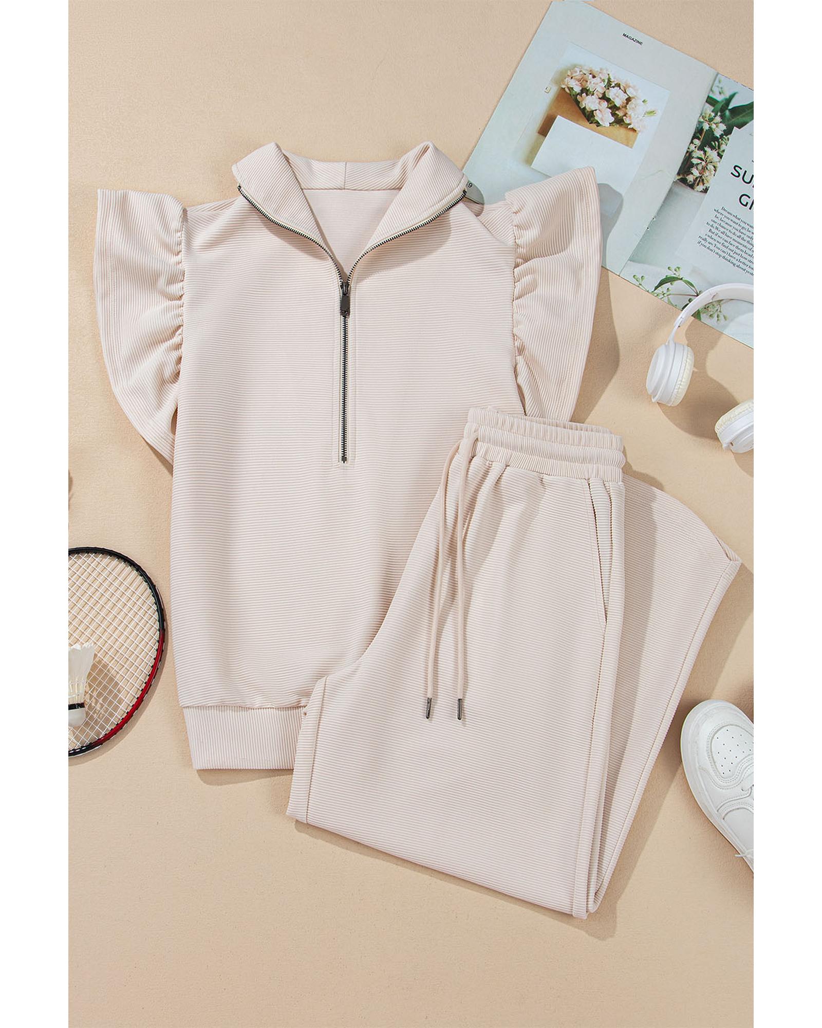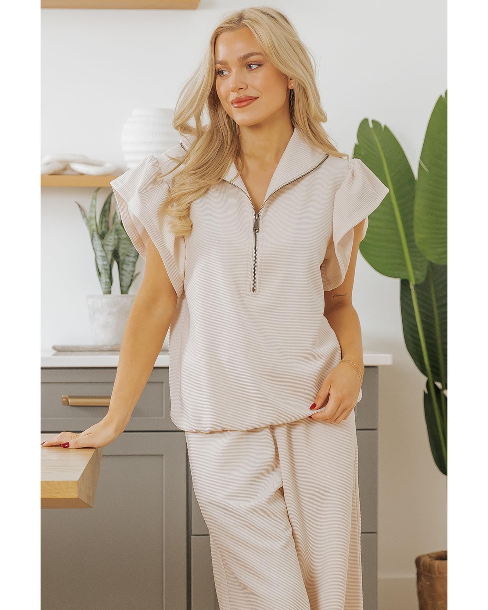 Apricot Textured Ruffled Sleeve Zipped Top and Wide Leg Pants Set – L