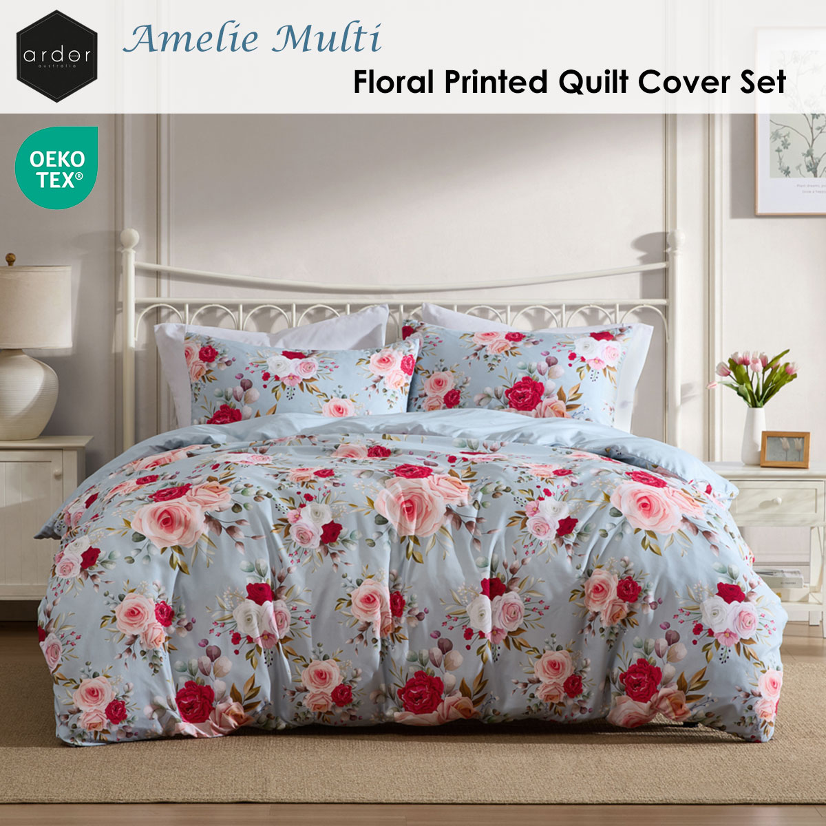 Elevate your bedroom decor with the Ardor Amelie Multi Floral Printed Quilt Cover Set. Soft blue, white, pink, red, purple, green, coral, brown, and grey, and cheerful bouquet hues come together in a playful floral design that adds a feminine and refreshing look to any space.