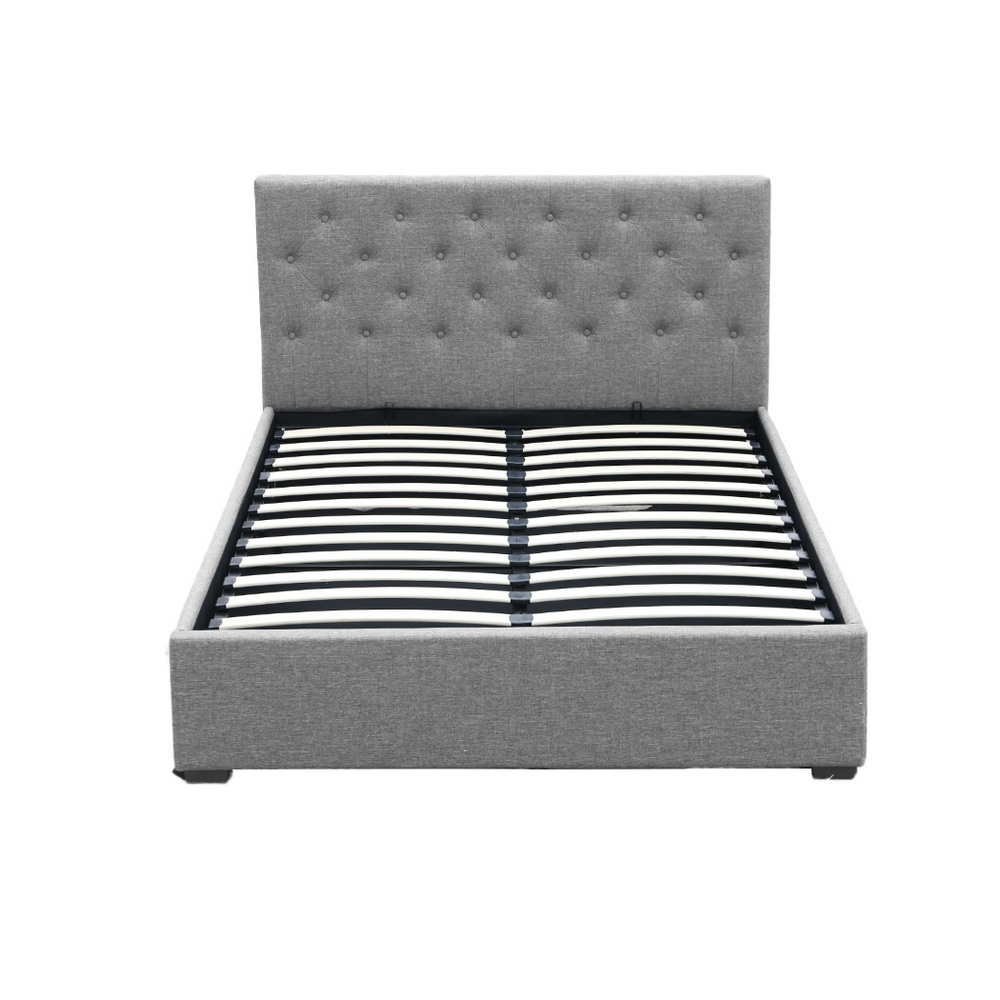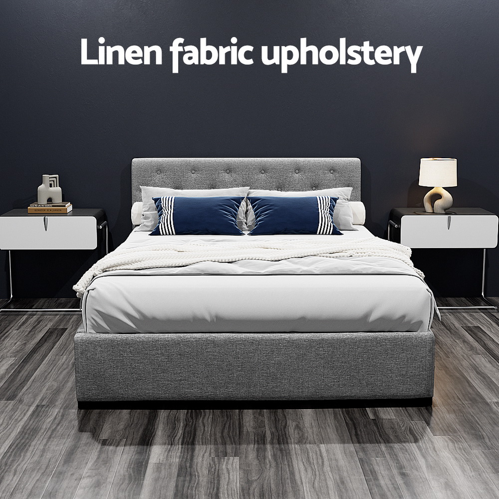 From the outside, our contemporary Artiss Vila Gas Lift Bed Frame looks absolutely plush. The premium linen fabric tufted headboard and sides all exudes fine craftsmanship. But theres more to this luxurious bed frame than meets the eye. Lift up the frame and you will find acres of storage space under the wooden arched slat base. The gas lift system certainly helps to free up existing space in your storage cabinets for other household things.The wooden arched slat base is also designed to flex appropriately so that it can better distribute the weight exerted on it. As such, it helps to minimize movement disturbances created when two persons are sleeping on the bed. Overall, the bed frame is well-built with reinforced steel bars within its sturdy steel frame. Heavy-duty metal connectors keeps the frame sturdy with additional central support from an adjustable centre support beam. Enjoy your wonderful sleep in more ways than one with our innovative Artiss Vila Gas Lift Bed Frame.