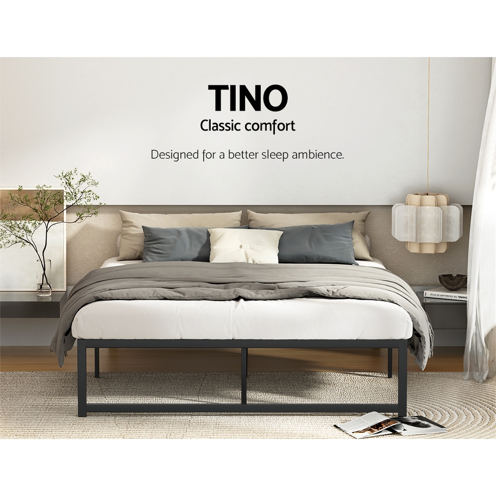 Looking for an affordable bed frame that doesn’t compromise on quality or style? Look no further than the Tino Bed Frame from Artiss. This minimalist bed frame features an enhanced powder-coated and rust-resistant steel frame with strongly reinforced steel centre slats to keep your mattress securely in place. With its simple design, this frame creates a clean, classic look that will transform your bedroom into a peaceful oasis of relaxation. It features ample space underneath to fit trundle drawers or other storage solutions, perfect for keeping your bedroom tidy. Plus, its neutral colour scheme ensures that it will complement any bedding or decor you choose to pair it with. Practical, functional and stylish, the Tino Bed Frame from Artiss is an easy purchase.