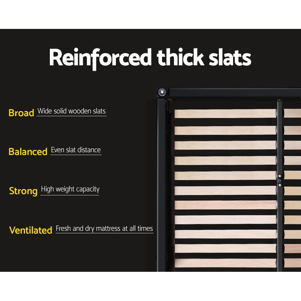 Constructed with a sturdy steel frame that’s reinforced with metal bars and heavy-duty connectors, the Mila Bed Frame is also padded with high density foam and upholstered in premium faux linen fabric for a soft and comfortable touch. The Bed Frame features a wooden arched slat base that helps to distribute weight evenly across the frame and a centre support strut to provide added stability to the overall structure.