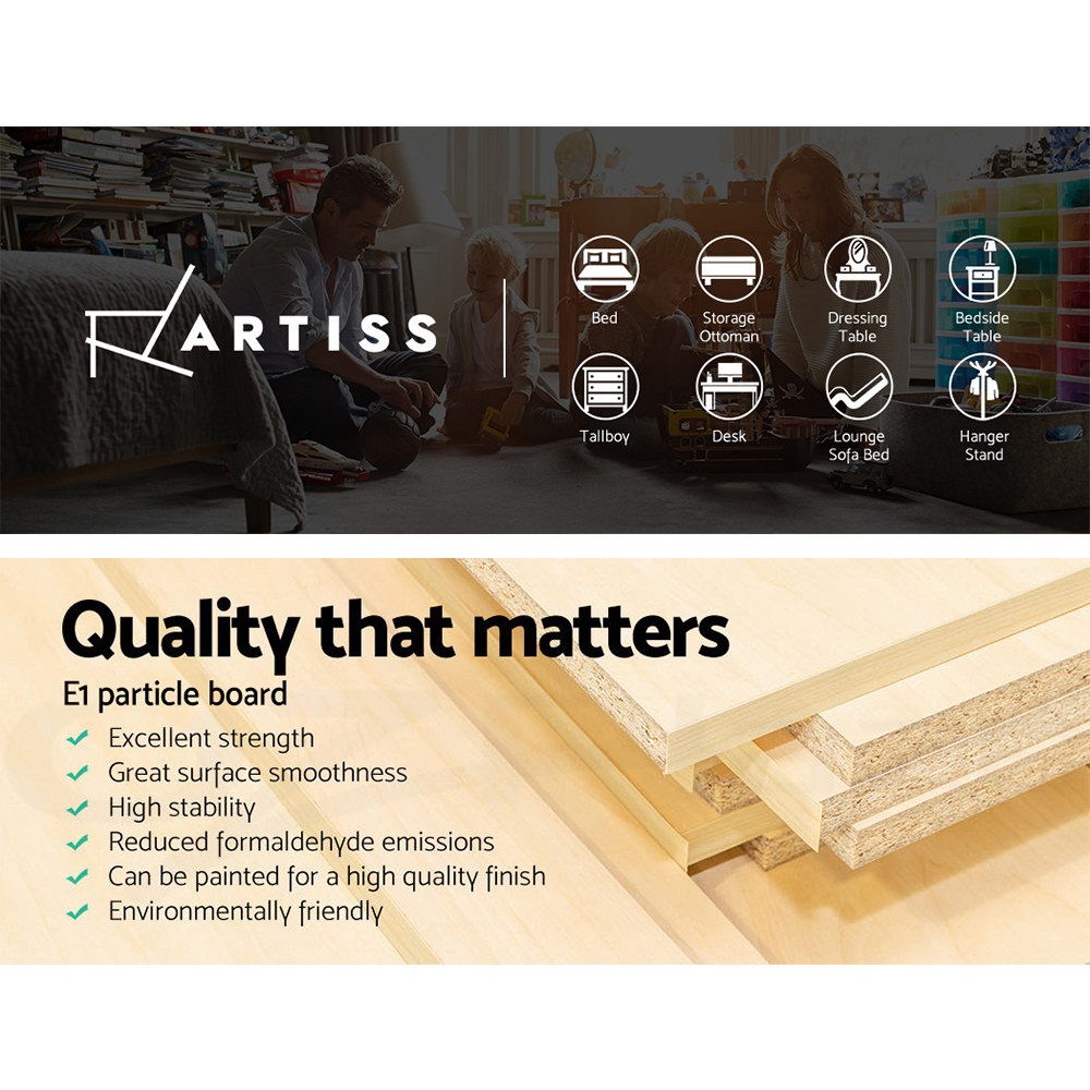 Vertical space. Horizontal space. Opened and closed storage. Our charming Artiss Bedside Drawer with Shelf offers a unique ensemble that gives you more practicality, greater durability and exceptional style. The smart-looking drawer is crafted with 12mm thick particle board with a smooth melamine finish for easy maintenance and cleaning as well as longlasting use. Use the 4-tier shelf for all your favourite displays and the opened and closed storage space for more bedside and personal essentials. The corners are rounded and safe while the air gap handle and raised height add touches of elegance and character that make this piece stand out from the mundane.